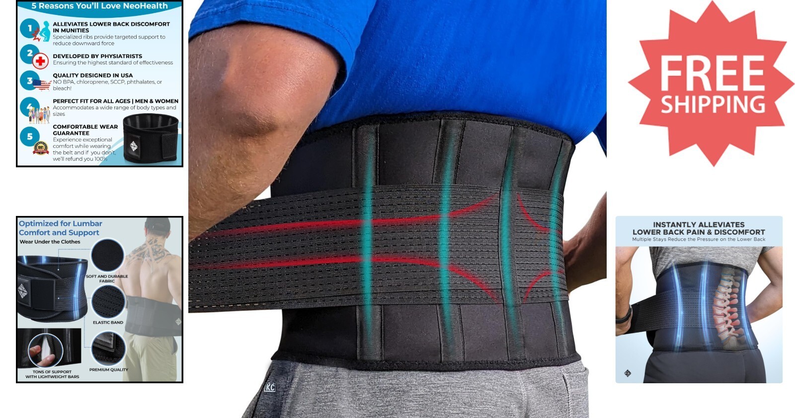 Experience relief from acute or chronic back pain with the NeoHealth Back Support Brace. Engineered with medical-grade vertical bars and dual tension straps, it stabilizes your back to reduce strain and prevent injuries such as muscle spasms, herniated discs, and sciatica. Designed for comfort and durability, it features a soft, non-toxic fabric that allows full range of motion and can be worn discreetly under clothing. Adjustable to fit a variety of sizes, this brace provides customized lumbar support for men and women during sports, work, or daily activities. Keep your back protected and enjoy a pain-free life with NeoHealth.