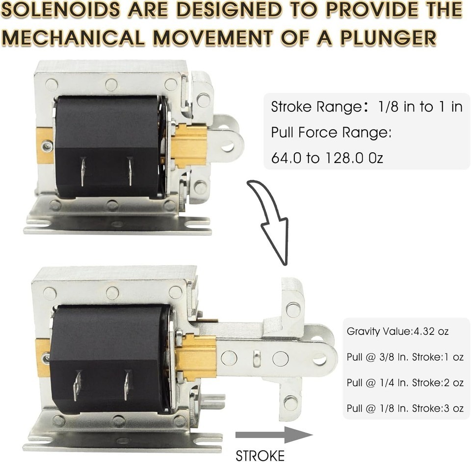 Specifications: Coil Volts 120V AC, Seated Watts 17.9W, Amps at Max. Stroke 4.9A, Stroke Range 1/8in to 1in, Pull Force Range 64oz to 128oz, Duty Cycle continuous
