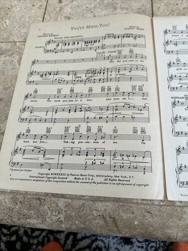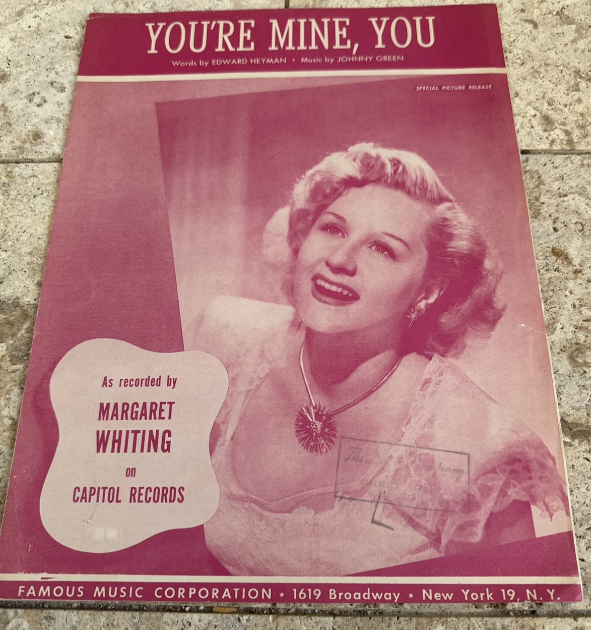 Original vintage sheet music for You're Mine, You with words by Edward Heyman and music by Johnny Green. Recorded by Margaret Whiting on Capitol Records. Published by Famous Music Corporation, New York.