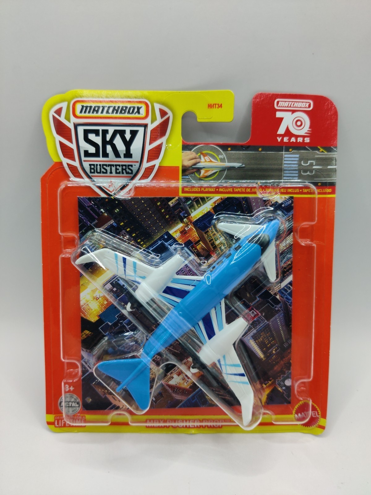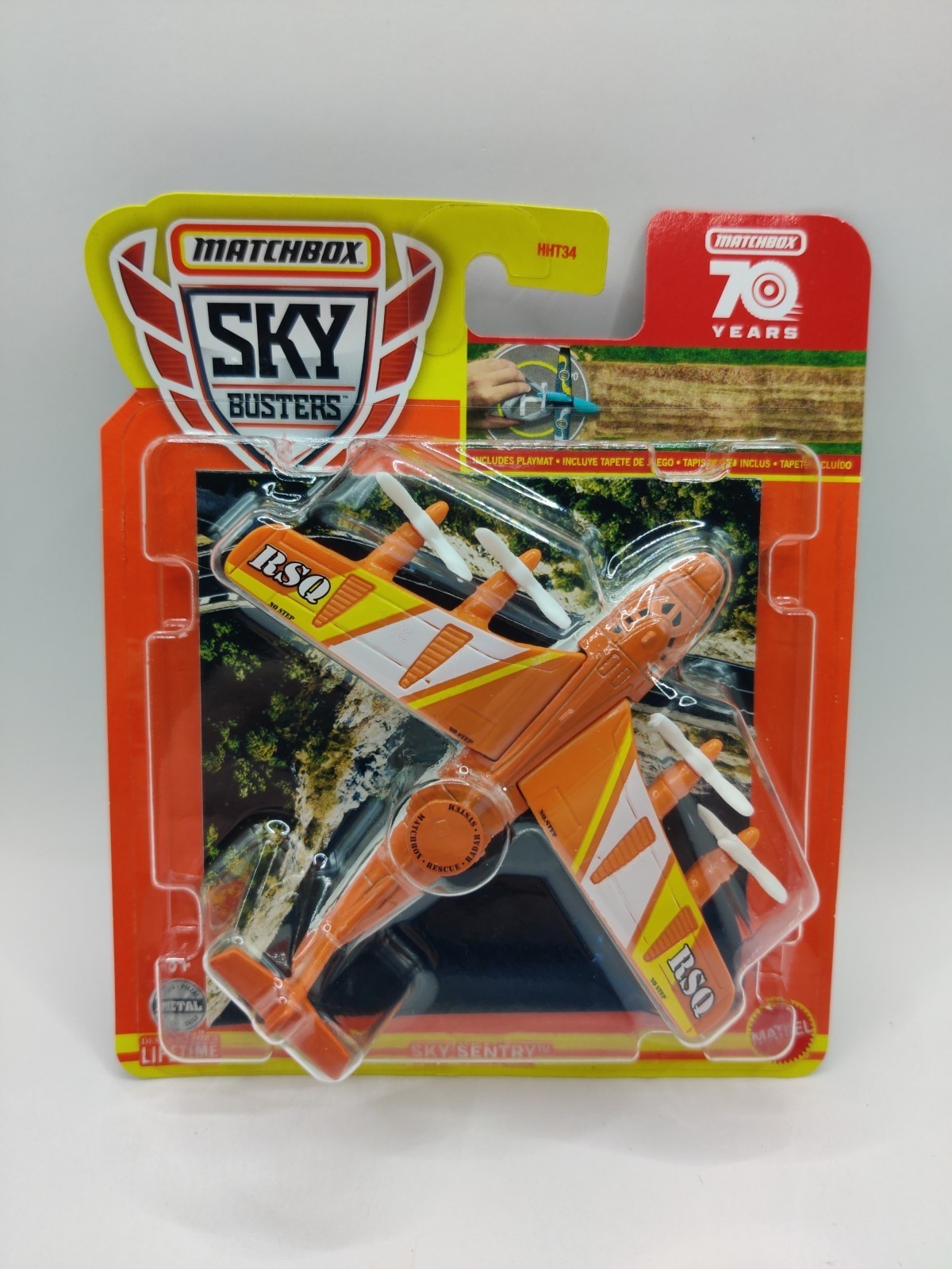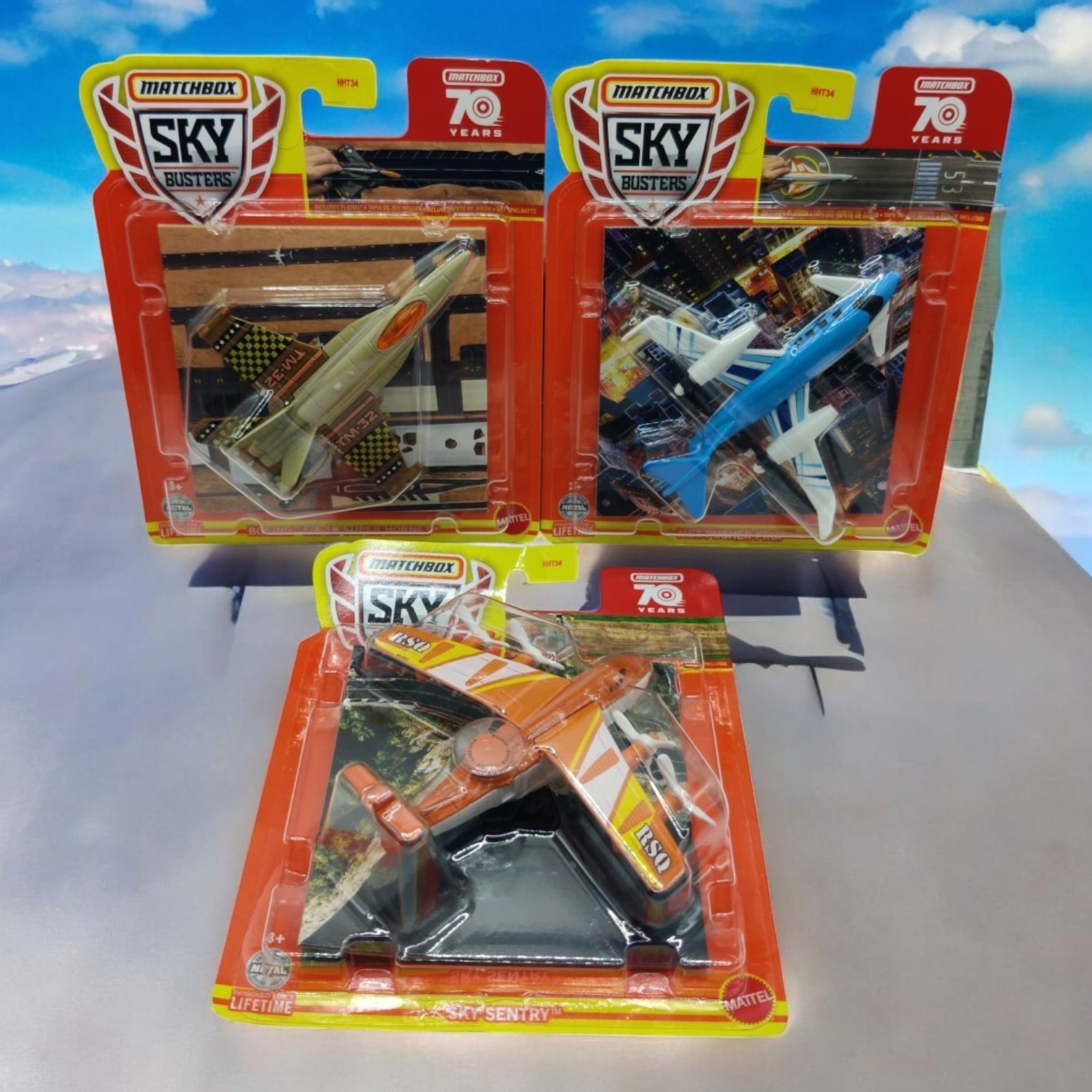 The Matchbox Sky Busters Boeing F/A 18 Super Hornet, Sky Sentry, MBX Pusher Prop Plane bundle is a 1:64 scale plane set made of plastic and metal.