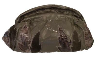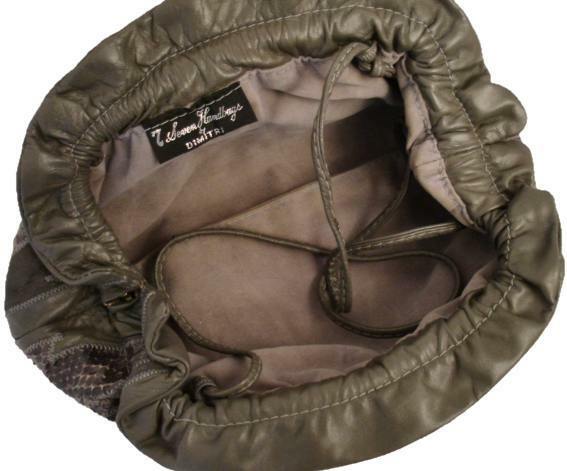 Seven Handbags by Dimitri is the label in this sassy vintage gray reptile appliqued suede convertible clutch. It is buttery soft and measures 8? high x 12 oe? wide with one-3/8? x 40? gray leather strap. It has a gray leather-covered spring frame closure and a light gray ultra suede lining. As pictured, there is one small area where the gray has worn off revealing silver underneath, but it is otherwise in excellent condition. The detailing is unique and radiates quality.