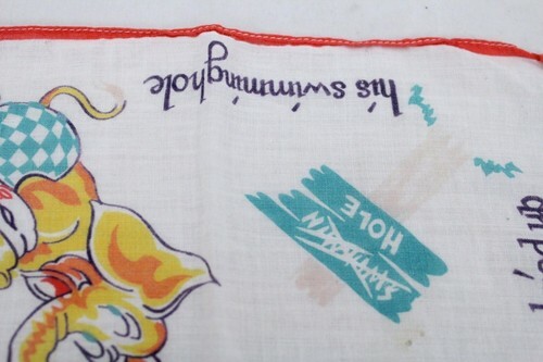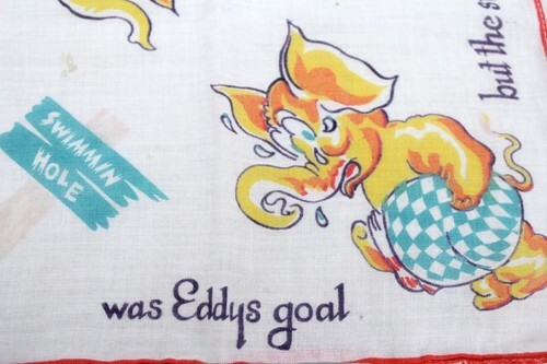 Eddy Elephant VTG1950s Children's Handkerchief Linen Red Orange Swimming Hole