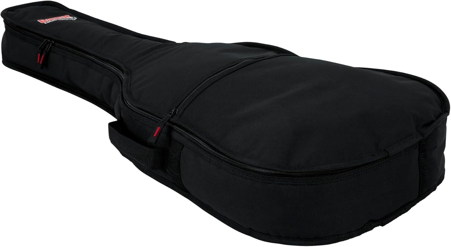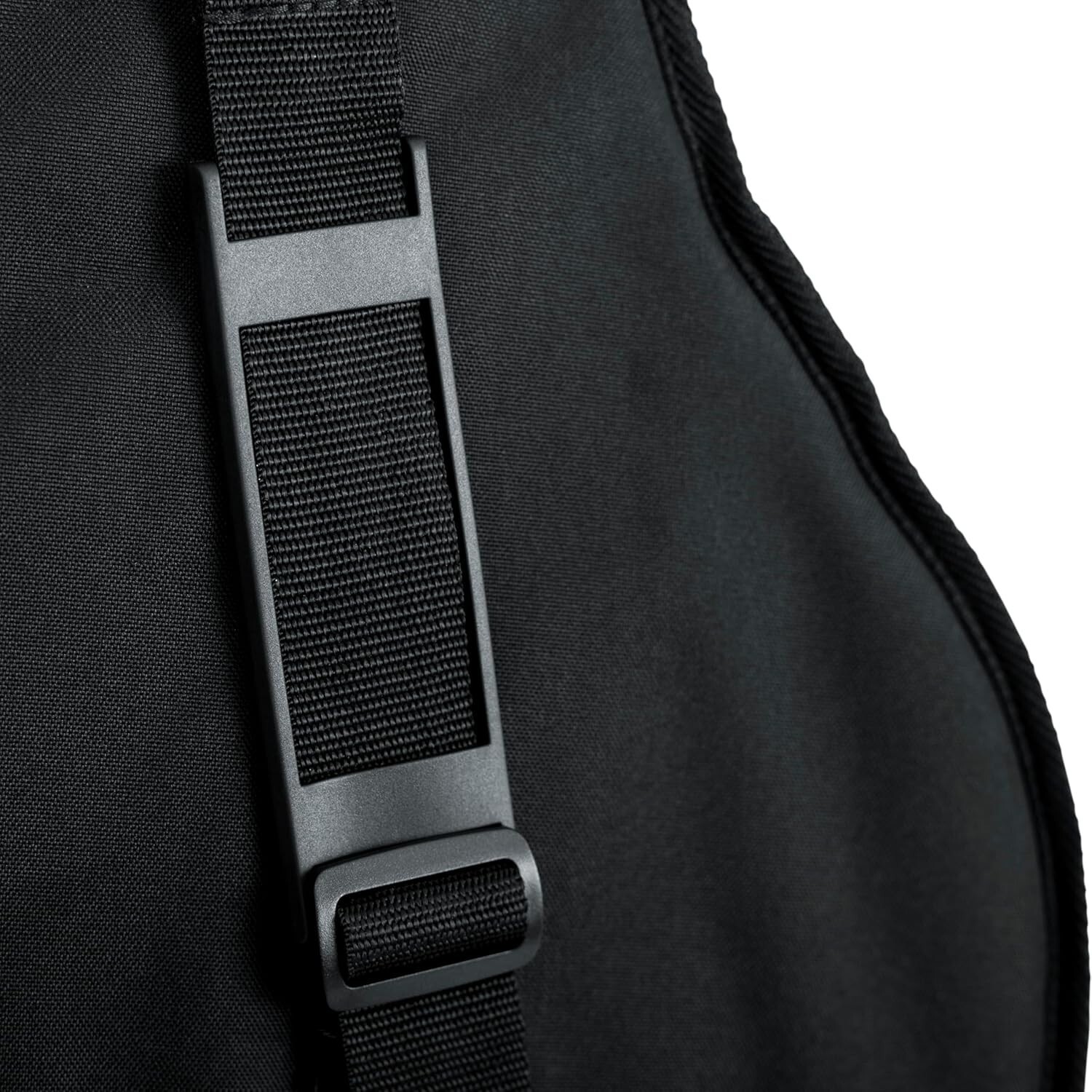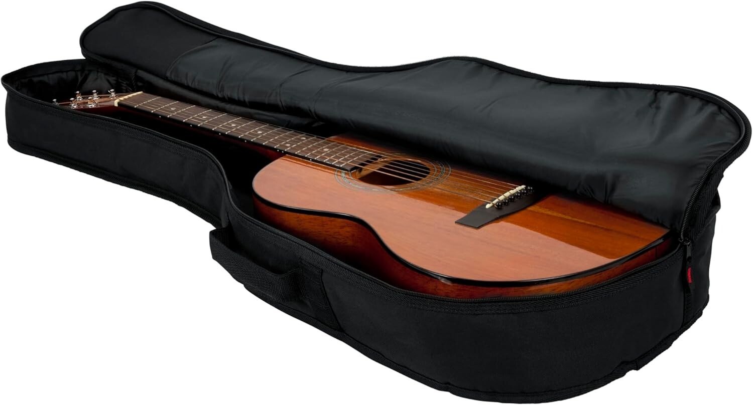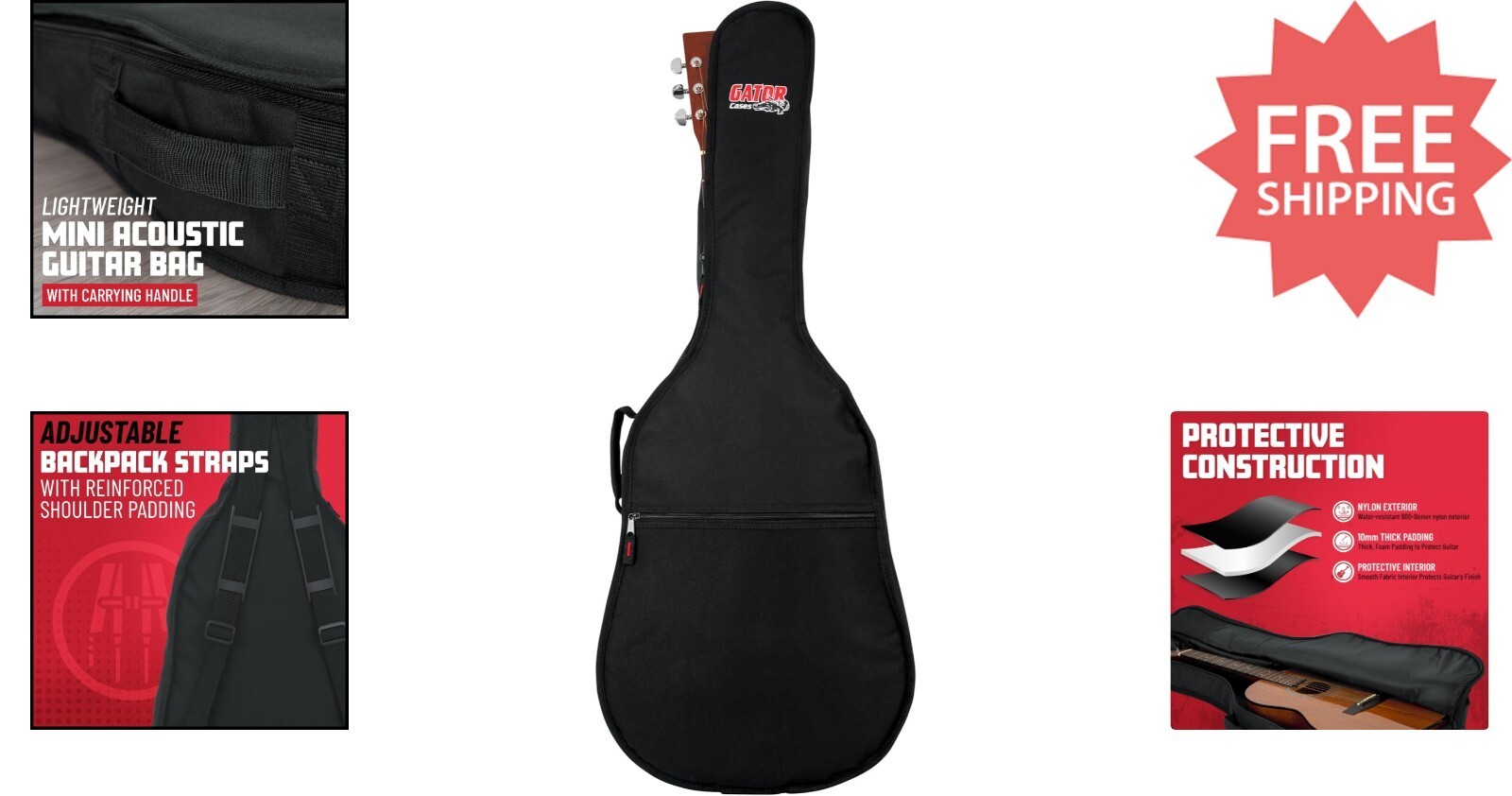 Protect your mini acoustic guitar with this economy gig bag, designed to fit instruments up to 3/4 size. Crafted from durable nylon with 10mm internal padding, it offers reliable protection at an affordable price. Features reinforced interior at the headstock and bridge, an exterior accessory pocket, and adjustable backpack straps for convenience. Interior dimensions include a body length of 21", a height of 4.3", and various width measurements to ensure a snug fit. Overall, this gig bag combines functionality and value for your mini acoustic guitar.