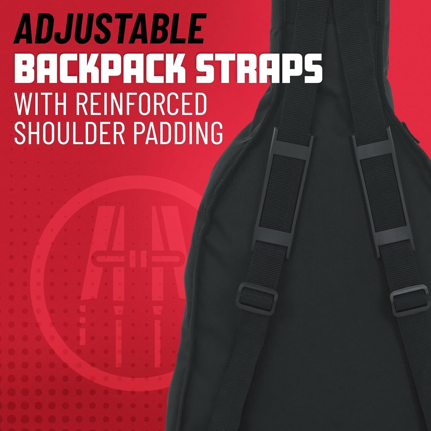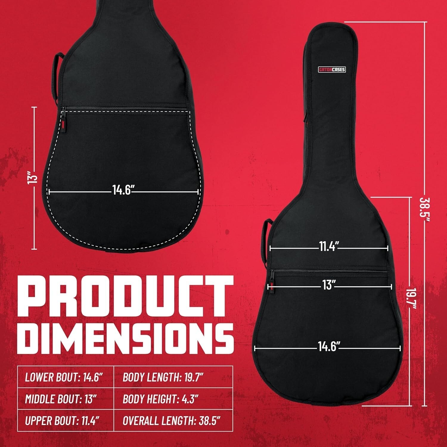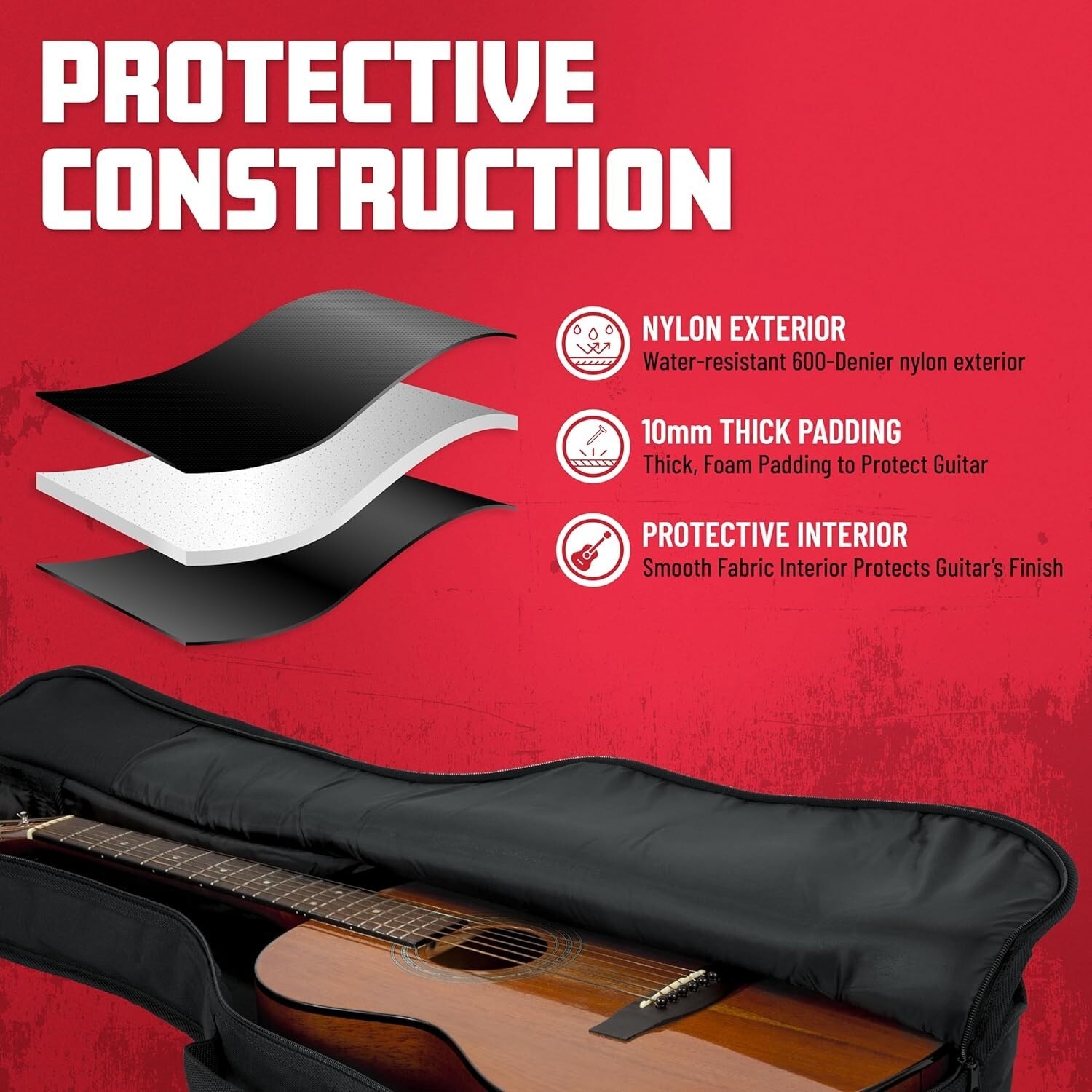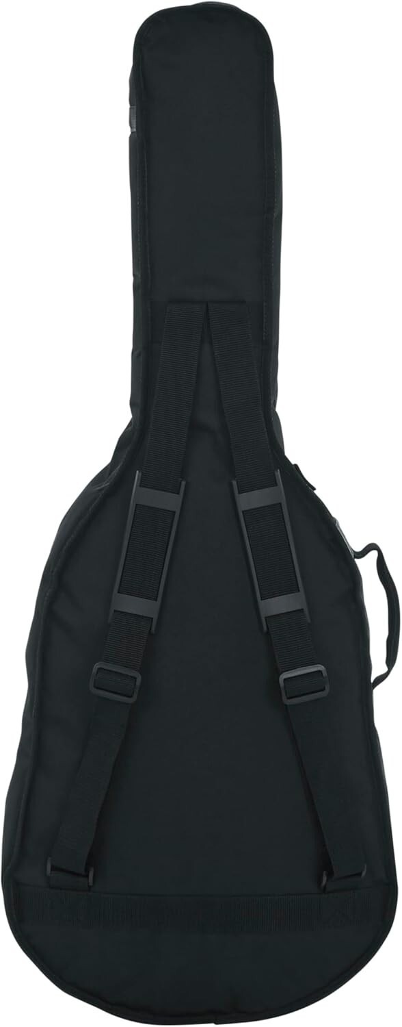 Protect your mini acoustic guitar with this economy gig bag, designed to fit instruments up to 3/4 size. Crafted from durable nylon with 10mm internal padding, it offers reliable protection at an affordable price. Features reinforced interior at the headstock and bridge, an exterior accessory pocket, and adjustable backpack straps for convenience. Interior dimensions include a body length of 21", a height of 4.3", and various width measurements to ensure a snug fit. Overall, this gig bag combines functionality and value for your mini acoustic guitar.