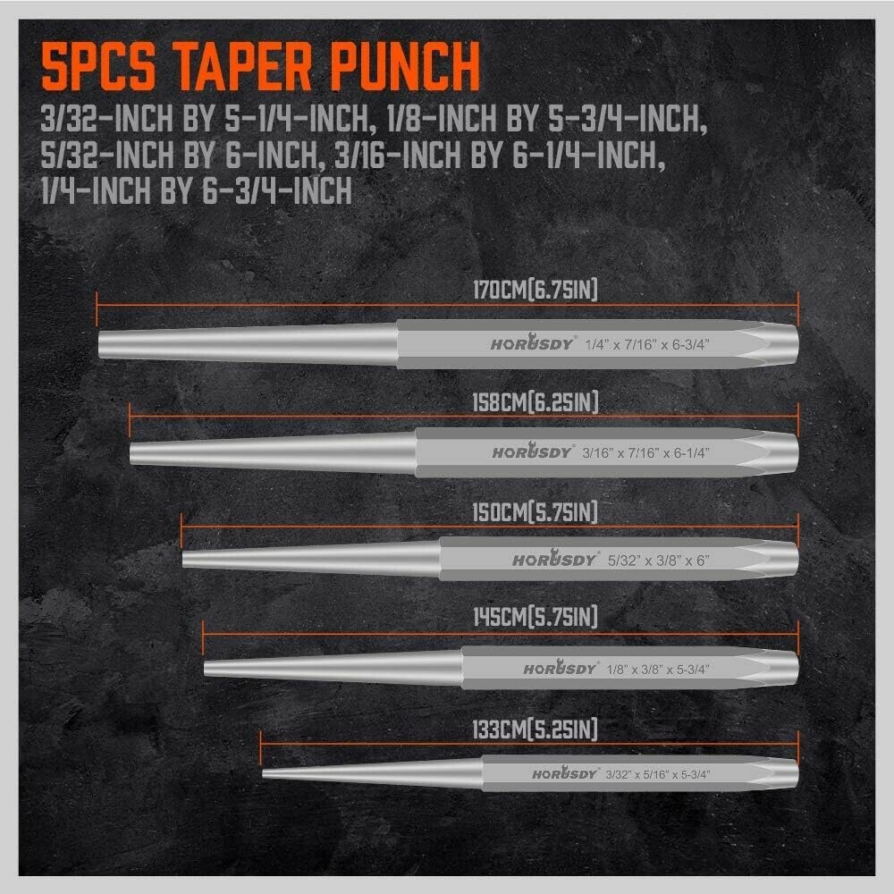 Discover our versatile set of punches and chisels, available in 16 distinct shapes and designs to meet all your workshop needs. Crafted from heat-treated chrome vanadium steel with a hardness of 54-58 HRC, these tools offer exceptional durability and resistance against wear. The collection includes tapered punches in various sizes, cold chisels, and center punches, perfect for precise alignment, separation, punching, and chiseling tasks. Whether you're working on delicate details or heavy-duty projects, this comprehensive set provides reliable performance and long-lasting tools.