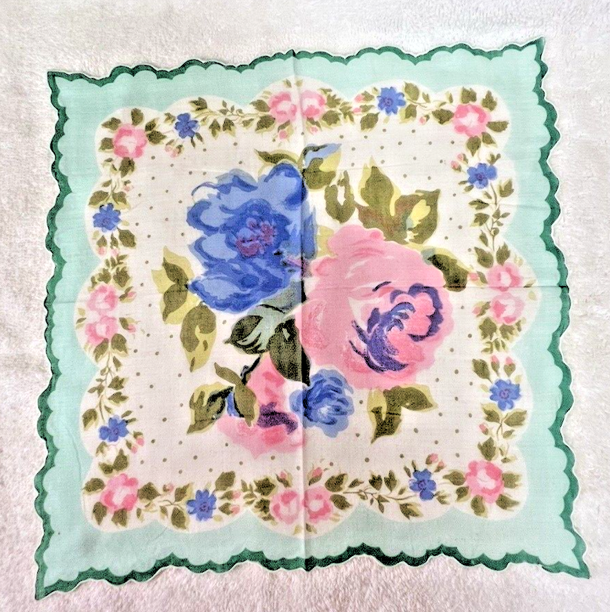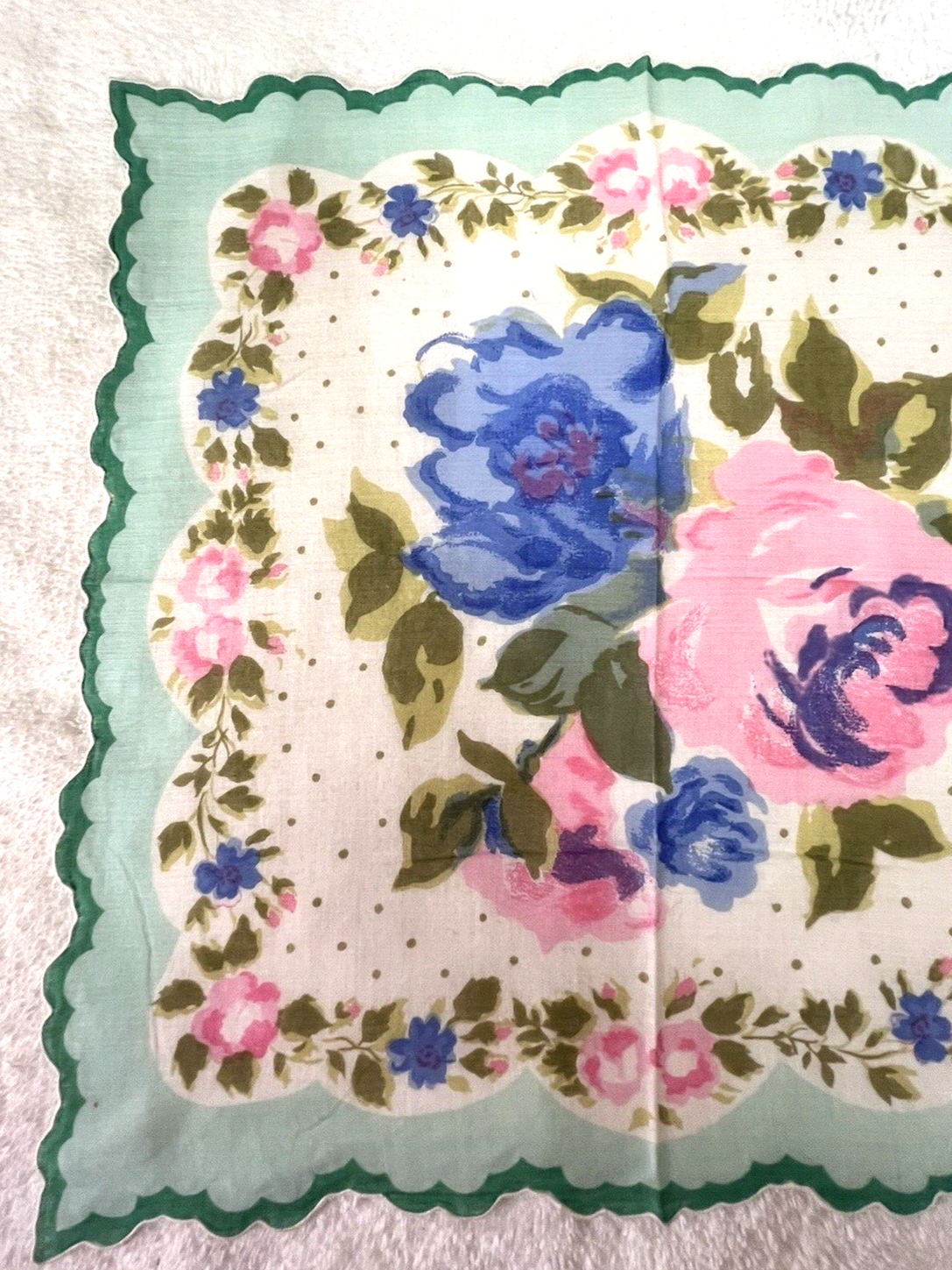Vintage Hankie Soft Water Colored Floral Print Pink Blue Soft Green 12 Inch The 2 3rd pictures show the minty green better no holes or stains