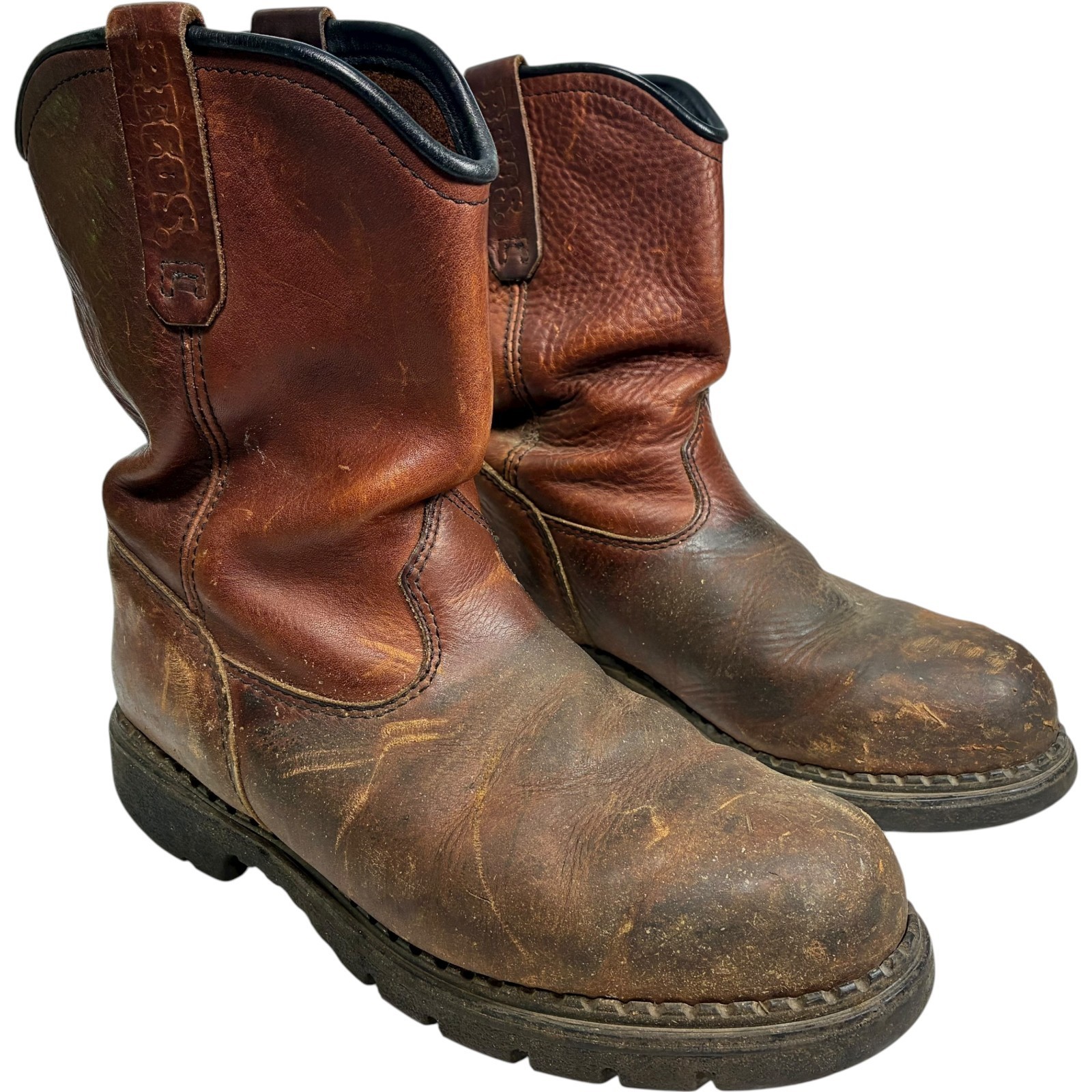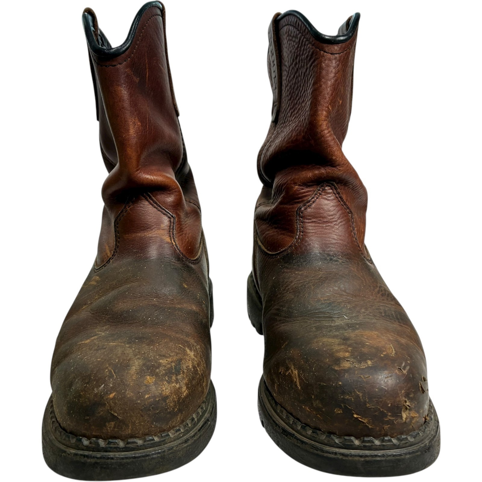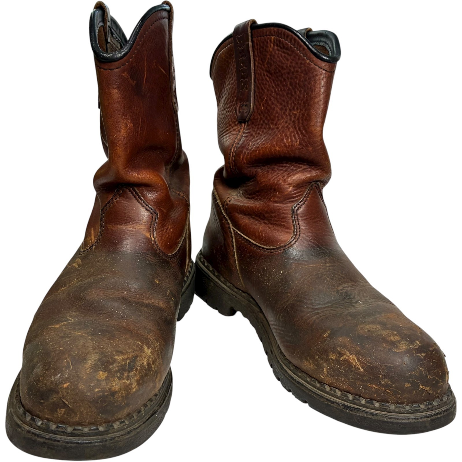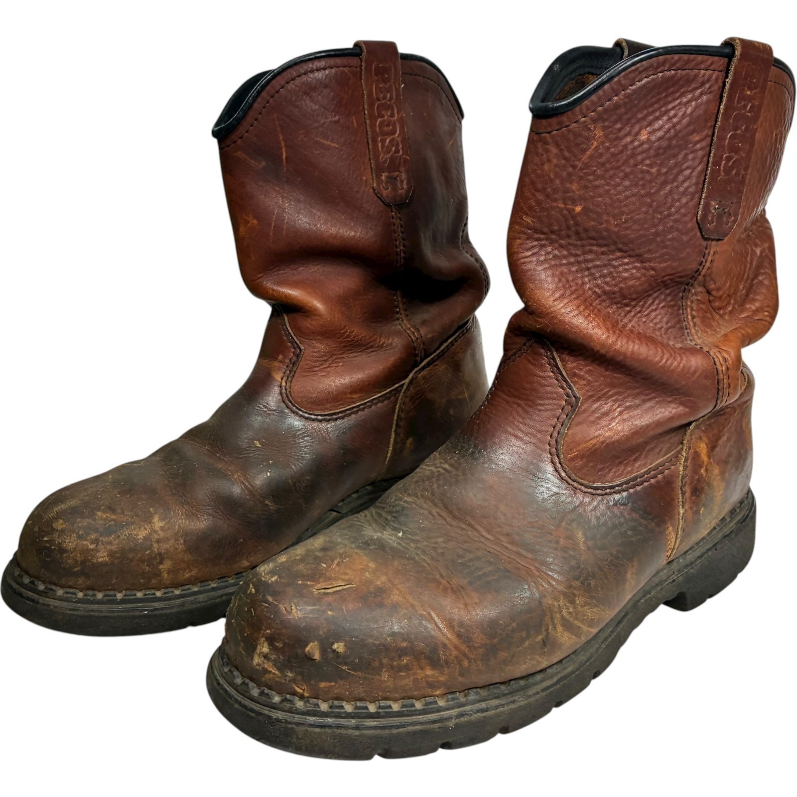 Red Wing Pecos men's brown leather steel toe work boots size 11 - note heel drag and scratches on toes