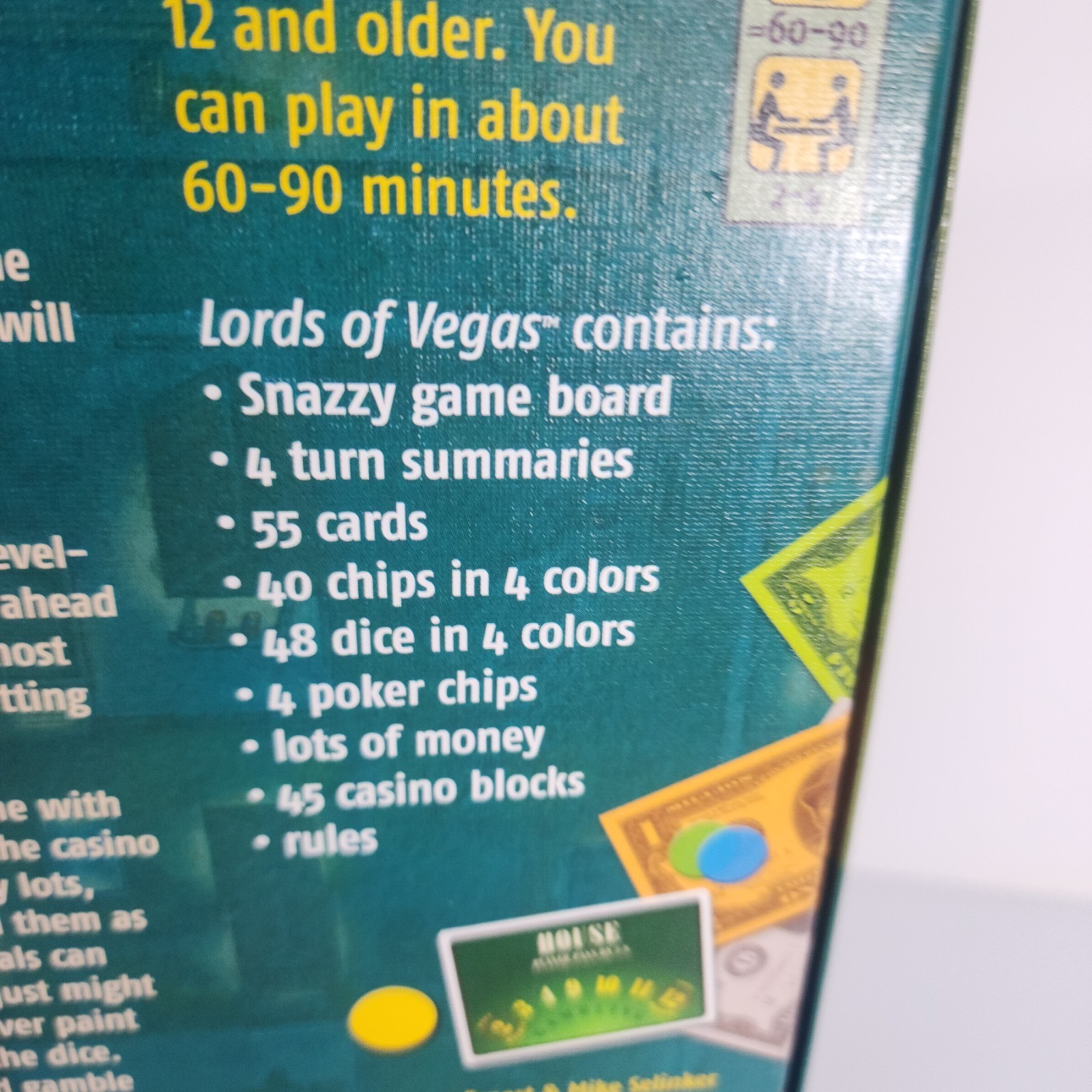 The product is the Mayfair Games Lords of Vegas board game, released in 2010. This complete in box (CIB) game is a modern classic in the world of board games, offering players the opportunity to compete as powerful industrialists seeking to dominate the city of Las Vegas. With the reputable brand of Mayfair Games behind it, players can expect a high-quality and engaging gaming experience with this strategic and immersive board game.