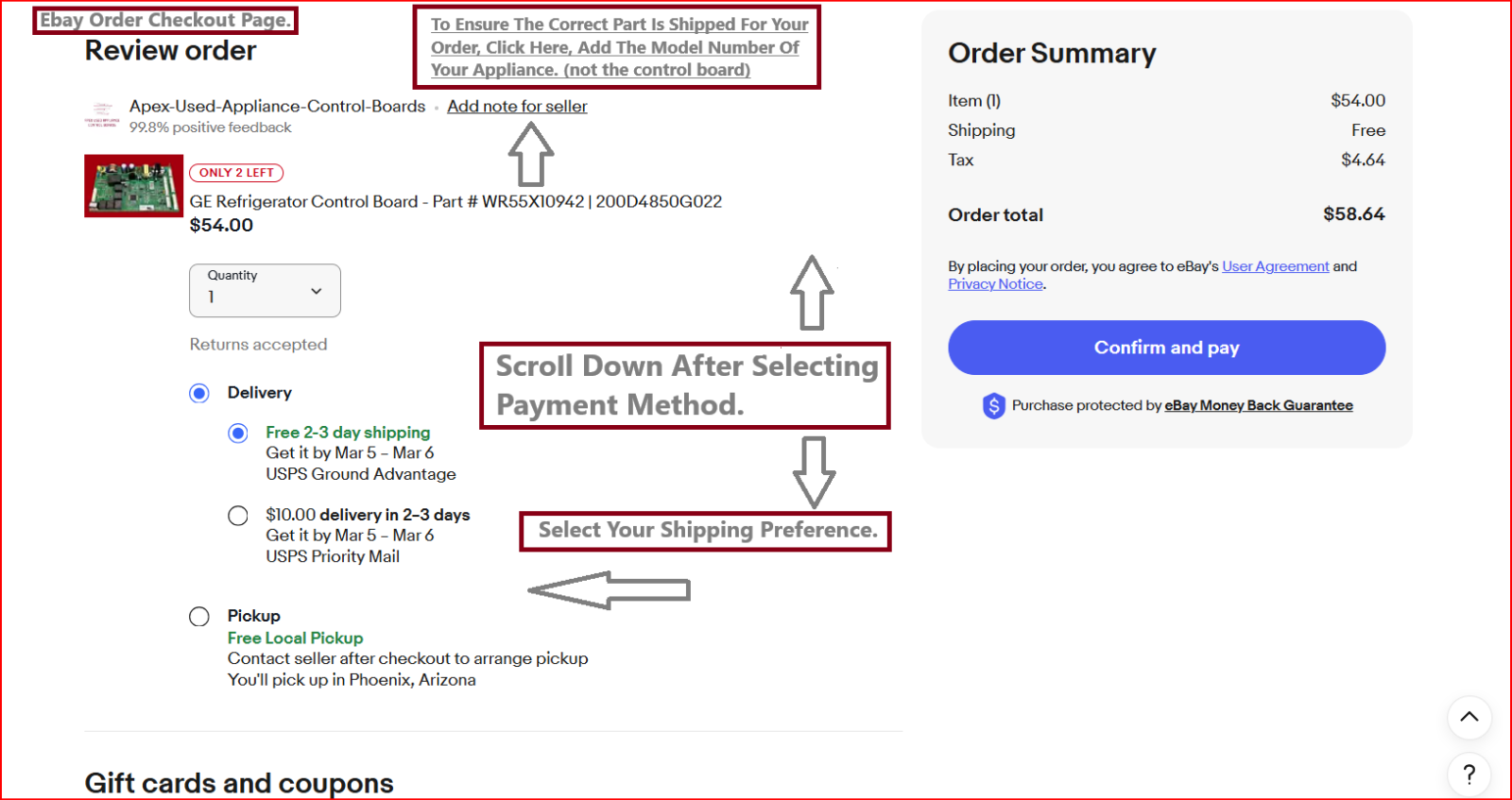 Refunds are issued when the item arrives and after it is re-tested. All returned items must have the Apex Used Appliance Control Boards mark and SKU barcode on them to be eligible for a refund. Total refund is 100% of the purchase price.