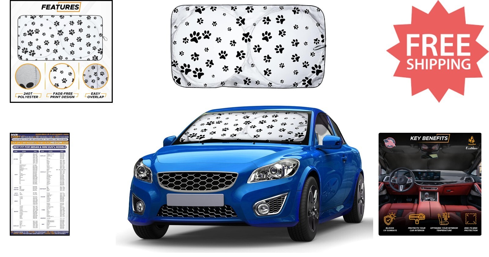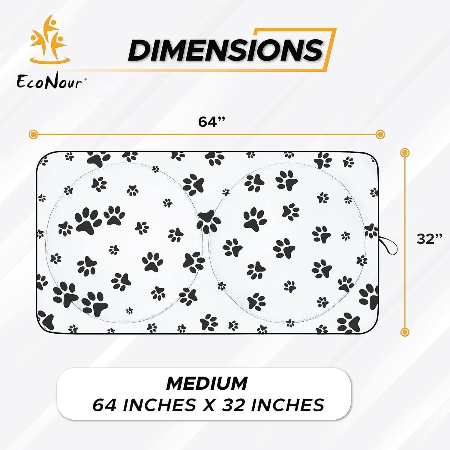 Protect your vehicle?s interior from the damaging effects of sun heat and harmful UV rays with the EcoNour Car Sun Shade for Windshield. Crafted from high-quality 240T material, it effectively maintains a comfortable interior temperature while adding a touch of charm with playful kitty and puppy footprints. Its unique footprint design and vibrant colors make it stylish and attention-grabbing. Designed for easy installation, removal, and storage in the included pouch, this universal fit measures 64" x 32" and provides complete coverage for compatible windshields. Enhance your driving experience with the EcoNour Sunshade?durable, convenient, and elegant.