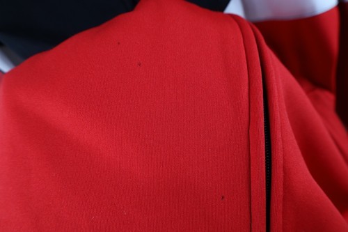 Burn holes front. Stains/blemishes throughout. Fabric pulls. Loose threads, discoloring cuffs. Graphics, color faded