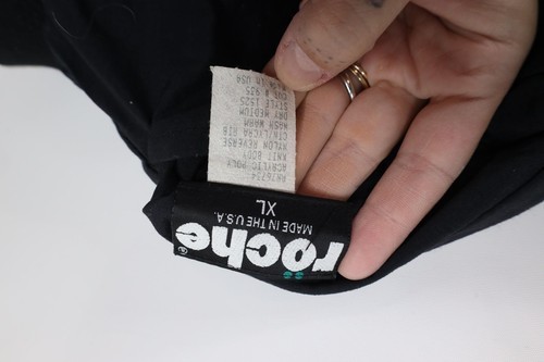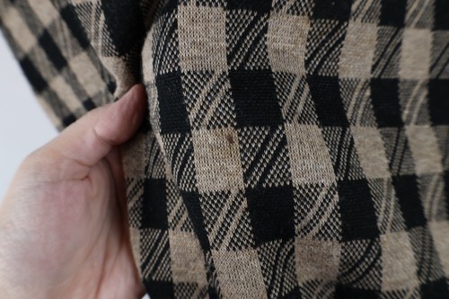 Reversible. Black side: stains front and back. Plaid side: Stain front middle. Has pilling. Color faded. USA made