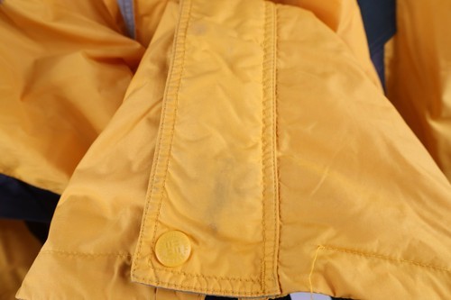 Stains throughout. Hole right arm. Loose threads collar, bottom hem. Logo distressed. Collar, cuffs discolored. Missing hood and liner. Thread bare spot left arm