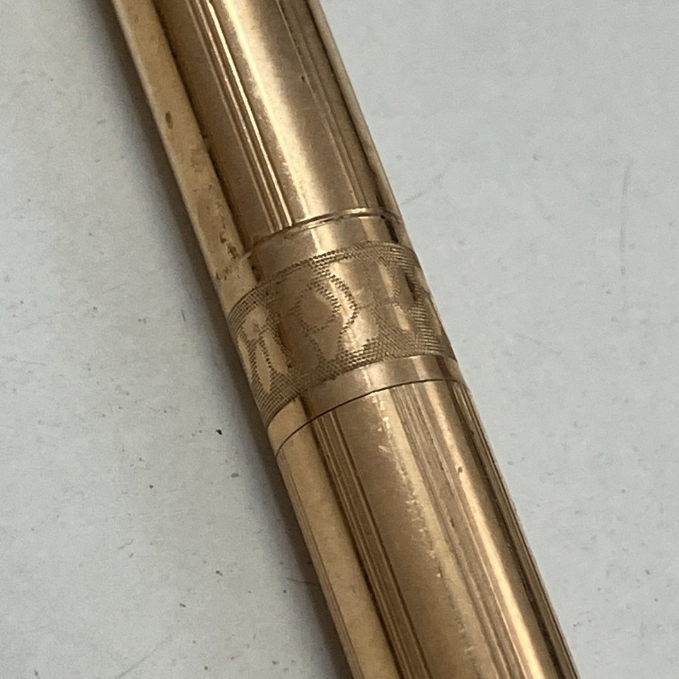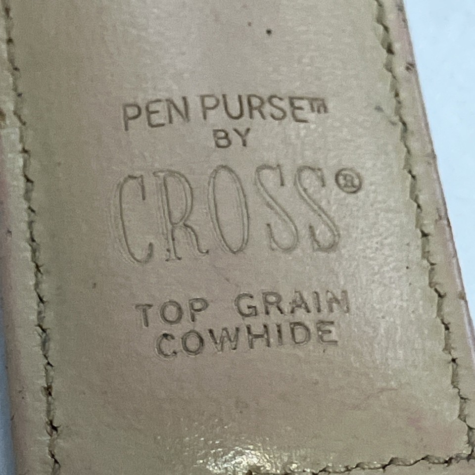 This product is a vintage Cross 14K gold filled ballpoint pen with floral etching, accompanied by a leather purse protector. The pen features a classic blue ink color and is a luxurious and elegant addition to any pen collection. The brand Cross is known for its high-quality and durable writing instruments, making this a both stylish and functional item for everyday use.
