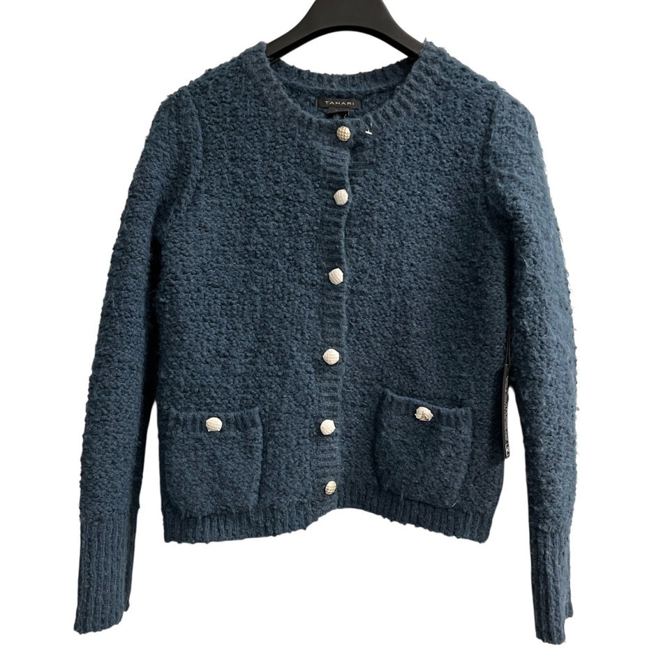 Tahari Sweater Blazer Womens XL Blue Fuzzy Knit Sliver Buttons Classic Capsule