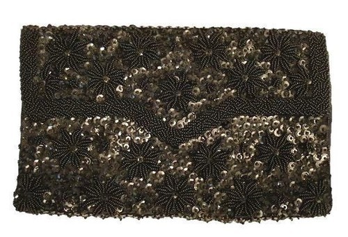 Vintage black seed bead and sequin silk satin evening clutch in a star-burst pattern with silvertone snap closure and one pocket. Lined in black satin.