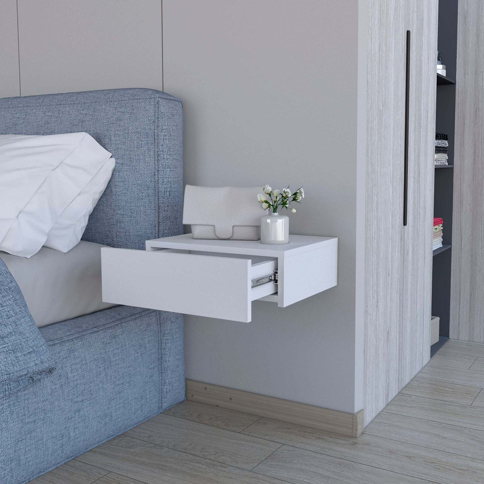 Experience the sleek, space-saving solution of the floating nightstand's wall-mounted design, enhancing room aesthetics while providing functionality