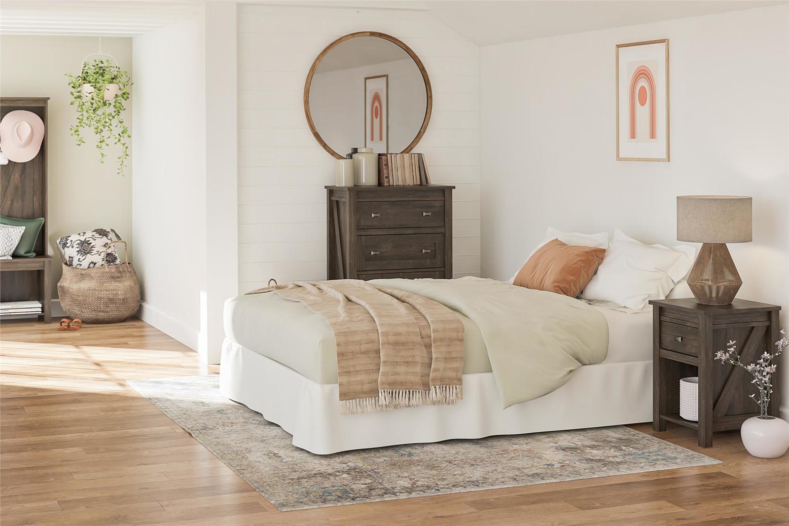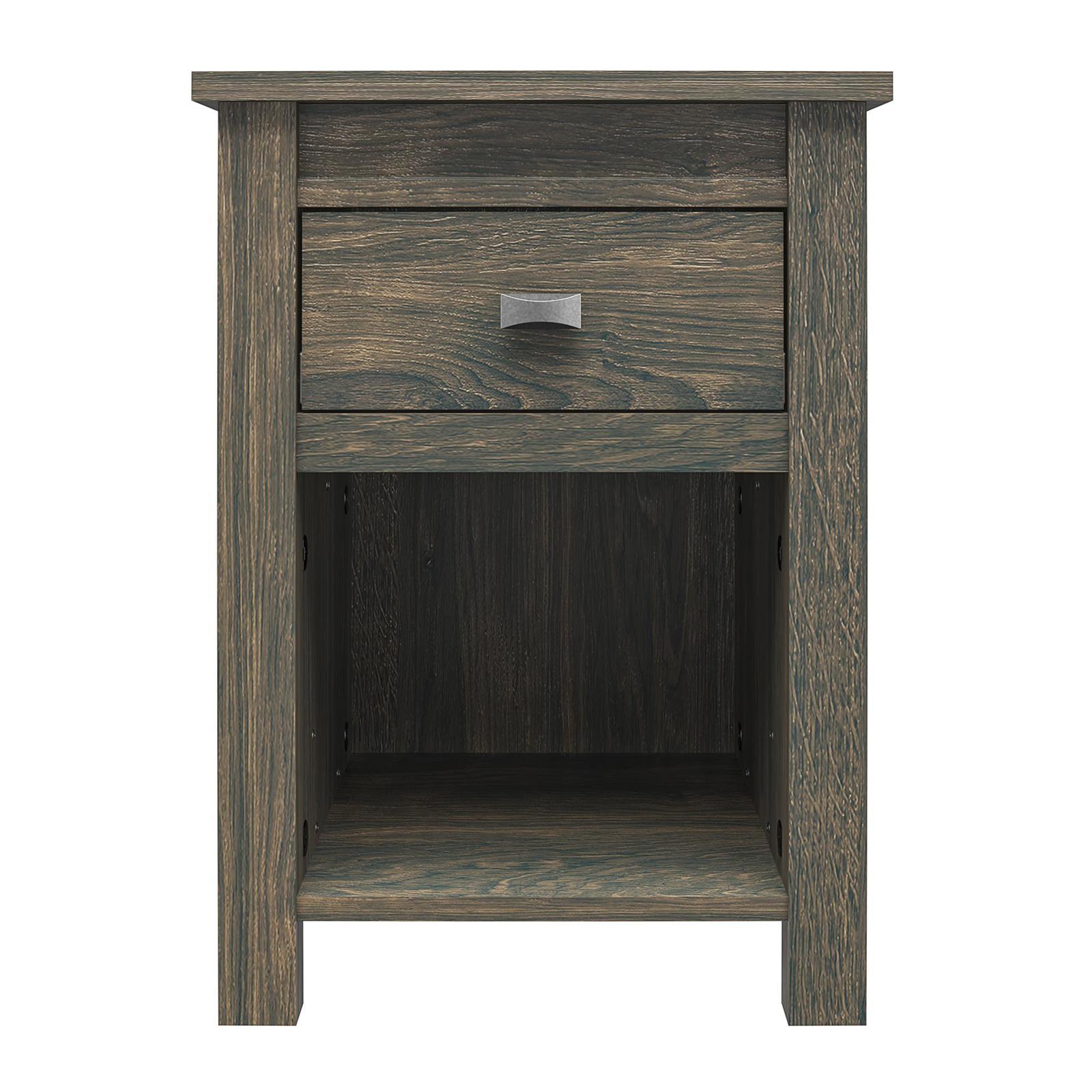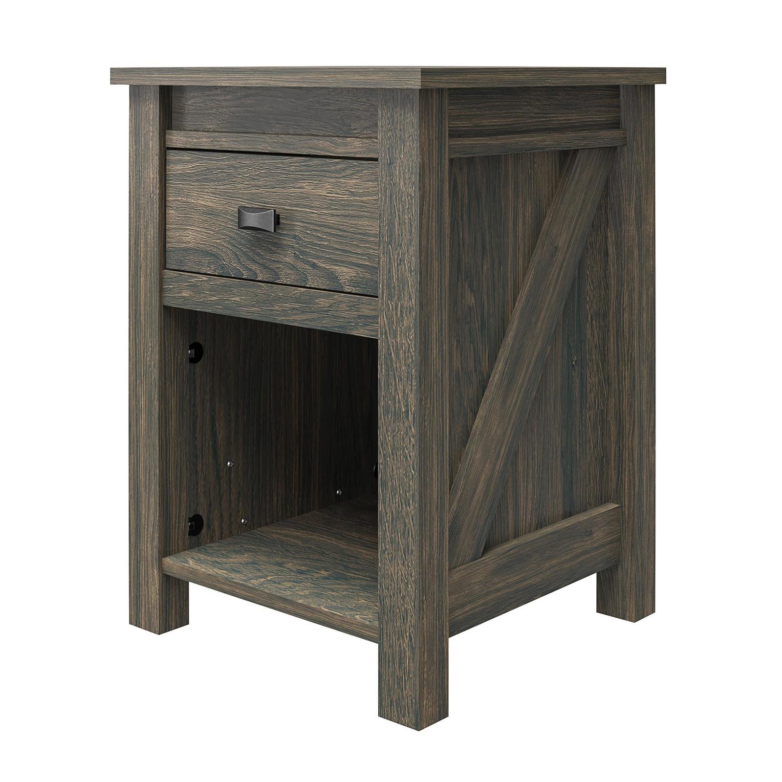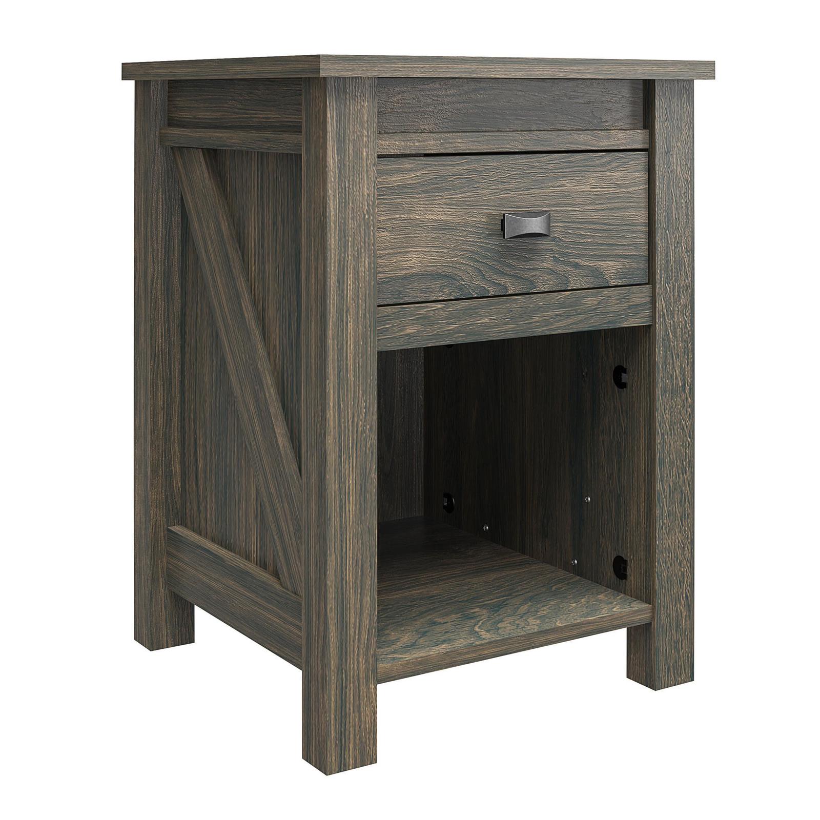 Complete your bedroom with the Farmington Nightstand. Inspired by the farmhouse style, this rustic Nightstand resembles a wooden barn door and adds a unique touch to your space. This sturdy Nightstand is constructed of laminated particleboard and MDF. The textured brown with gray undertones finish has an old reclaimed wood appearance that has been further enhanced with an oil rubbed bronze pull. Not only is this Nightstand incredibly stylish, but it's also very practical, with concealed and open storage to keep your room organized. Use the top surface for your reading lamp and keep glasses and charger in the pull-out drawer. The cubby is the perfect place to keep magazines or books for a little nighttime reading. The Nightstand ships flat to your door and requires assembly. Two adults are recommended for assembly. Once assembled, the Nightstand measures to be 24.41'H x 17.80'W x 17'D.