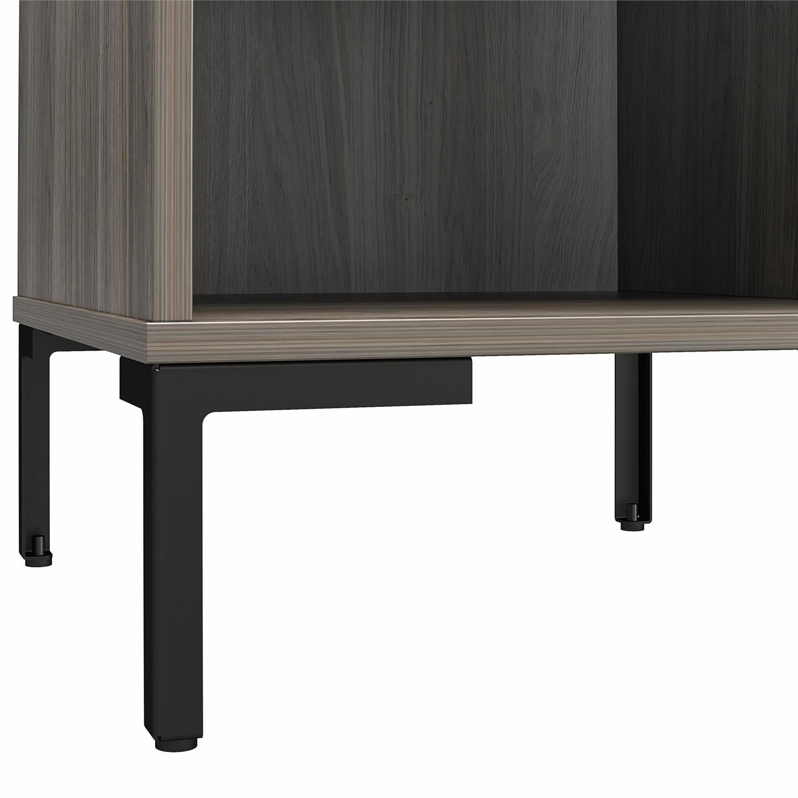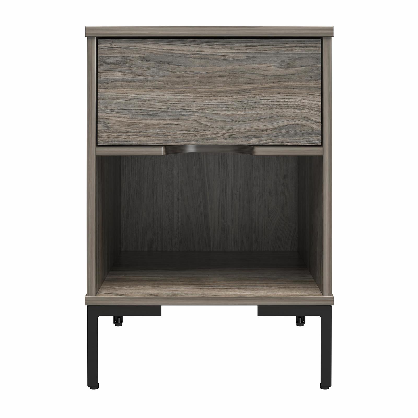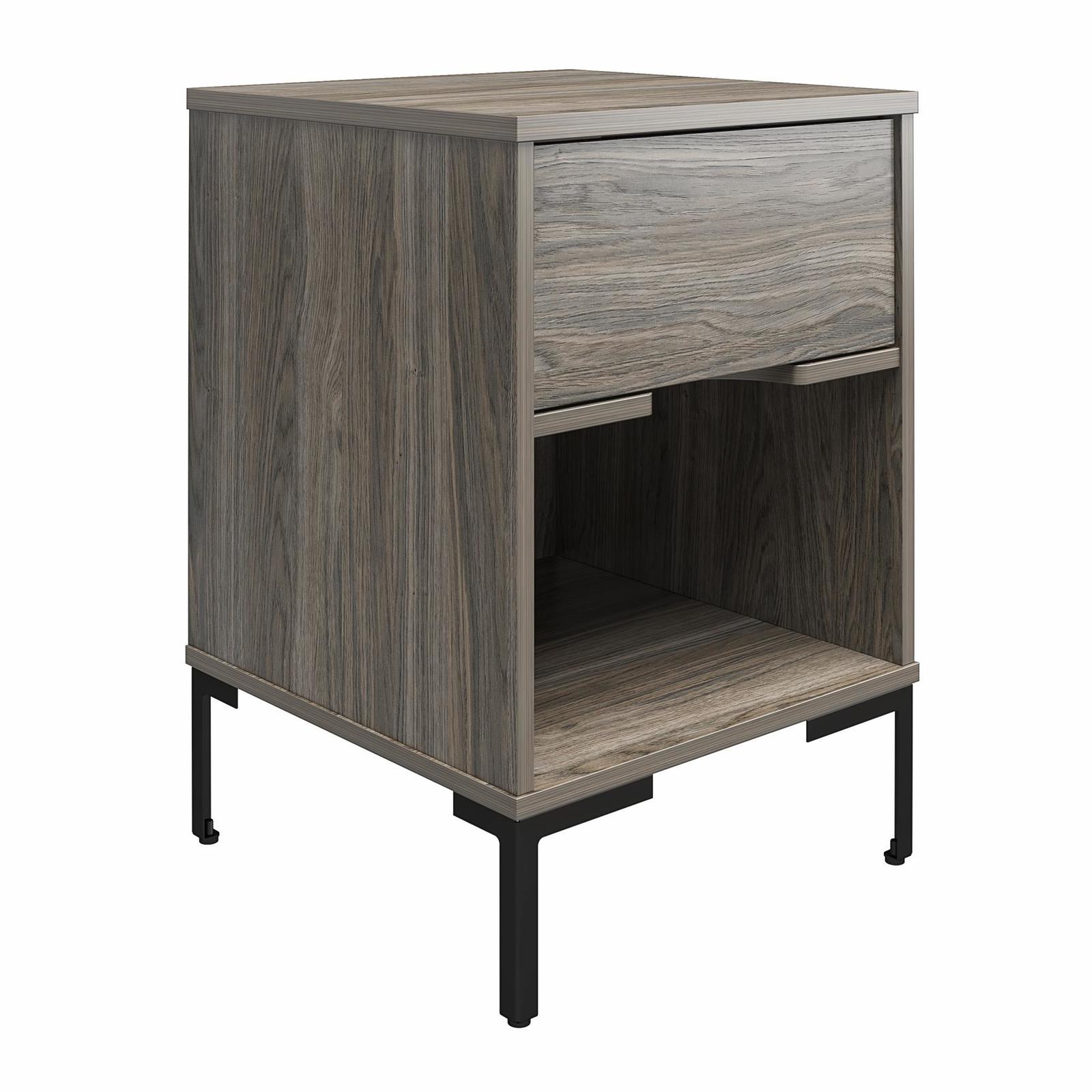 It's time to stop losing sleep over poor decor and give your bedroom a little face lift with the rustic, yet refined, Rolland collection. This simplified take on utilitarian forms is edgy enough to take on industrial spaces with a nod toward sophisticated elegance. The Nightstand features a spacious drawer for bedside belongings and is constructed from durable MDF and engineered wood atop black powder coated metal legs. An open storage space below the drawer presents the perfect place for books and allows ample space for personal items, while the cut-out handle gives the Nightstand a sleek, modern persona. This nightstand ships flat to your door. Two adults are recommended for assembly. Assembled dimensions: 17.7'W x 17.7'D x 26'H. Top and open shelf can each hold up to 40 lbs. Drawer can hold up to 15 lbs.
