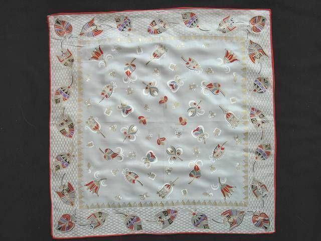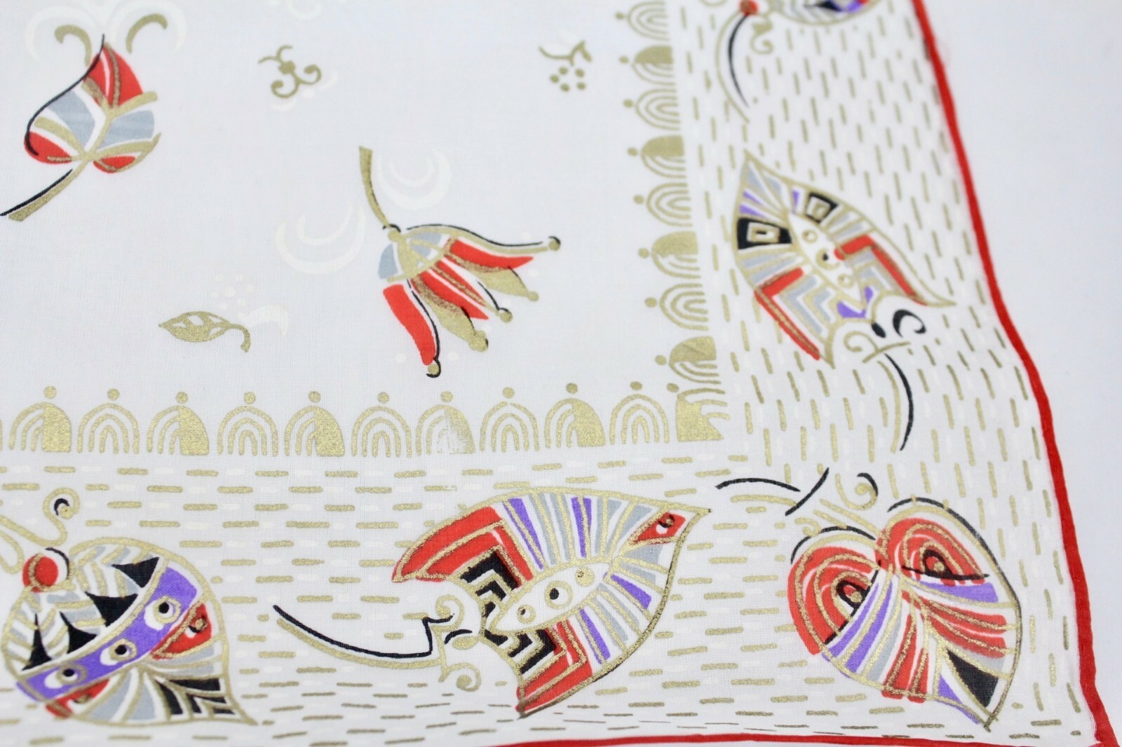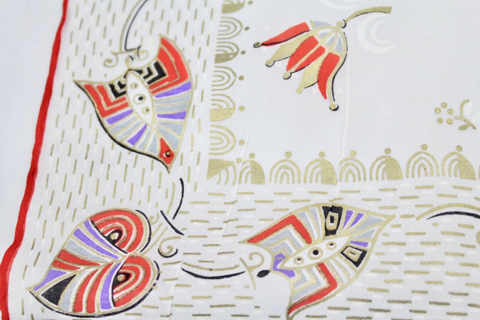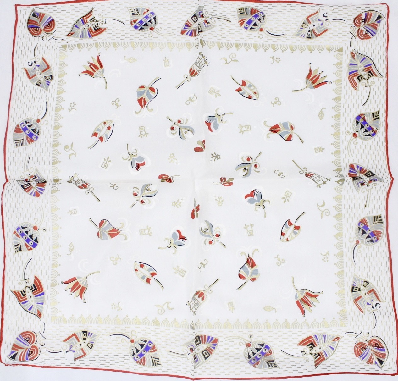 Vintage White rayon oriental-inspired scarf from Japan. The design consists of multi-colored leaves and flowers on a white background with a red hand-rolled hem and gold accents. There are a few very small watermarks near the center as shown, but it is otherwise in excellent condition. Measures 18" x 18".
