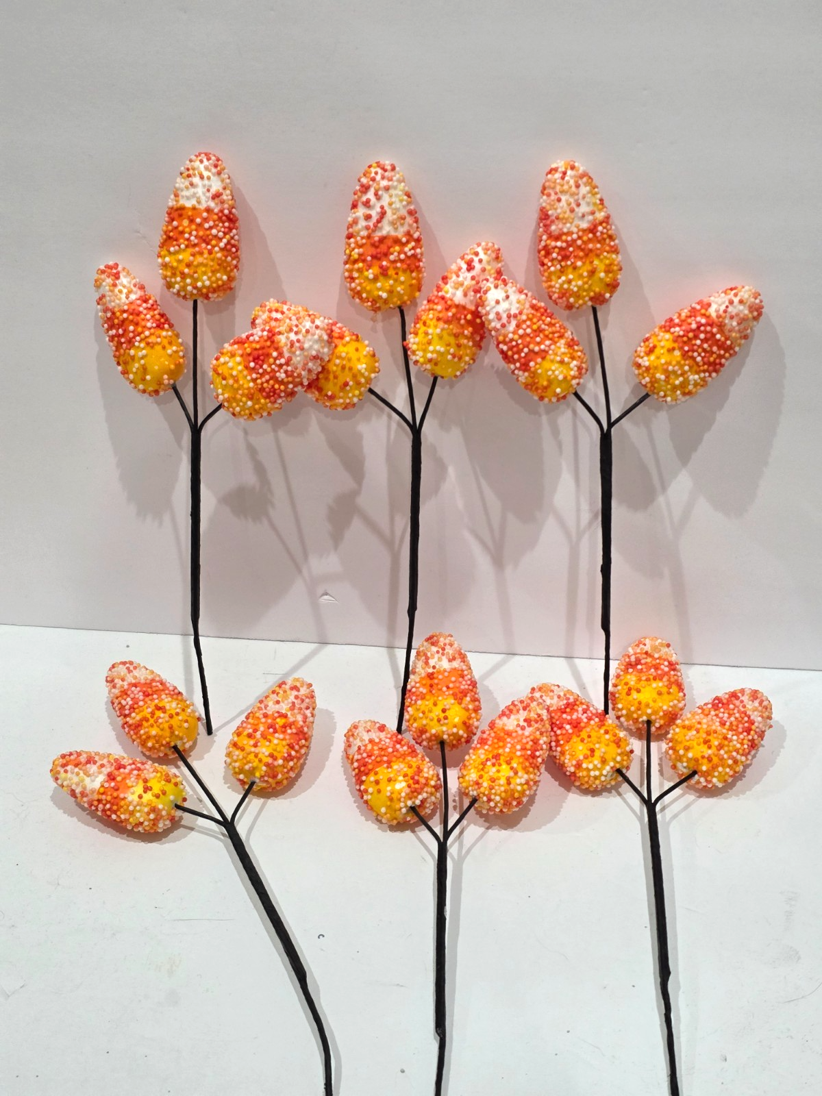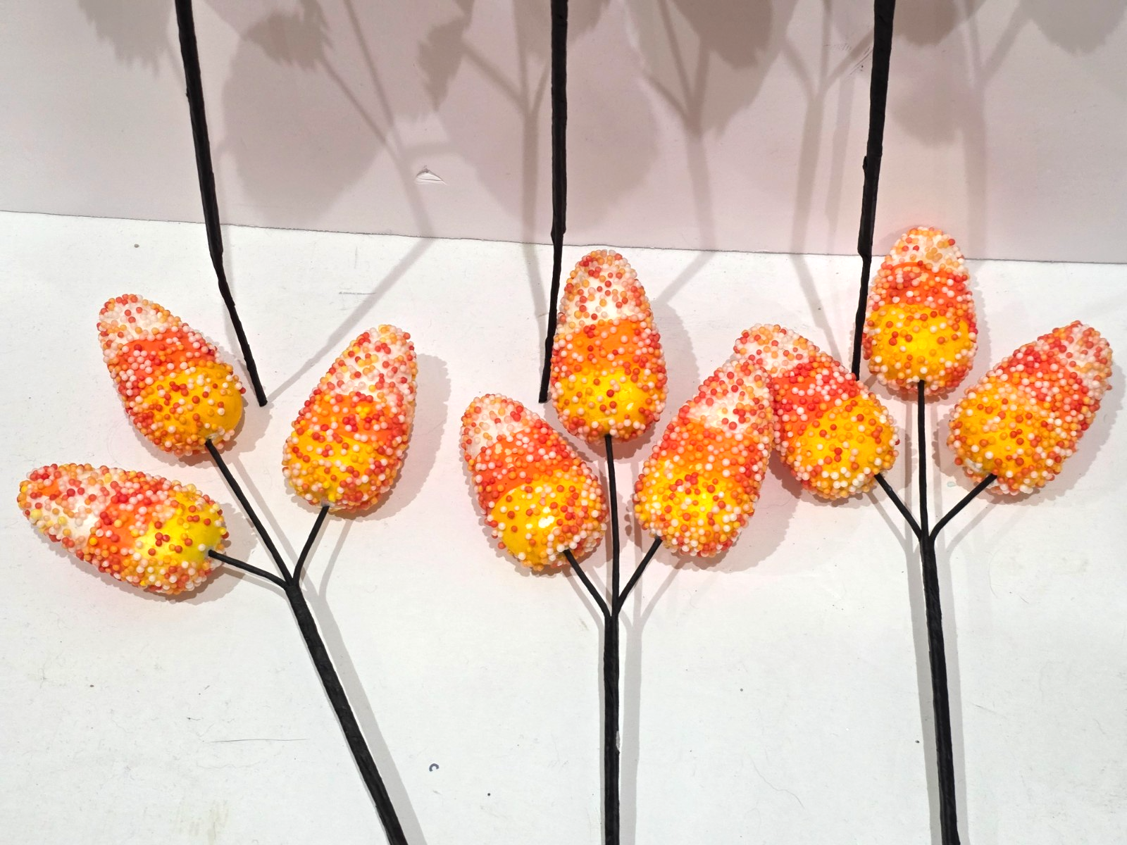 Up for sale we have these 2 adorable candy corn picks for your Halloween decor. The candy corns are made of styrofoam and have sprinkles. Total legnth is 12.5" and just the cany corns measure 3". New set of 6. Please not some may have sprinkles that have fallen off.