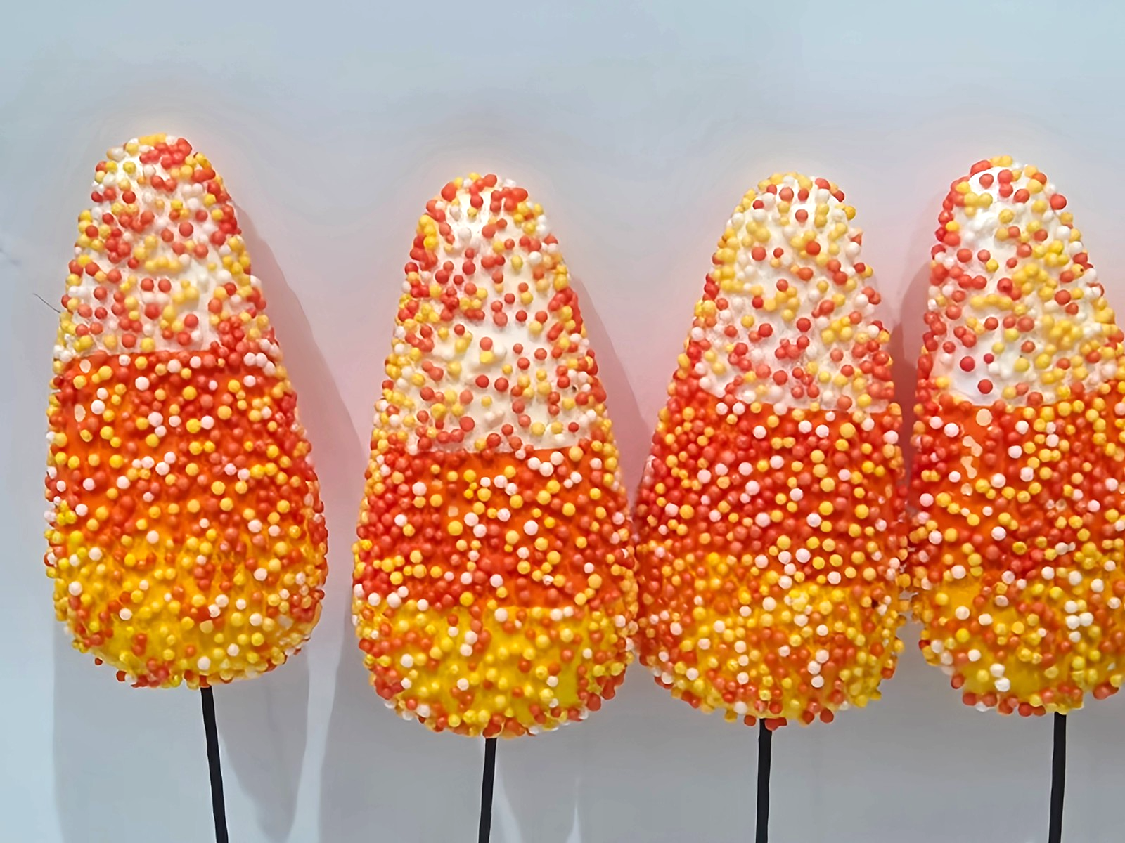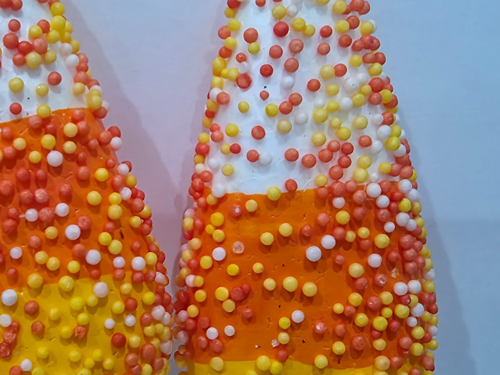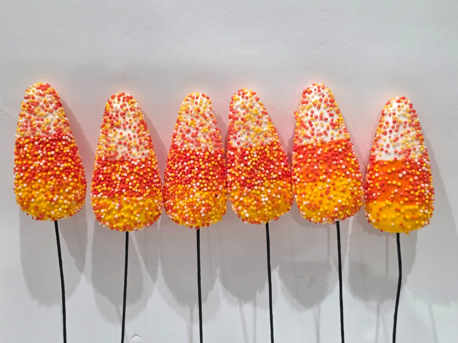 Up for sale we have these 2 adorable candy corn picks for your Halloween decor. The candy corns are made of styrofoam and have sprinkles. Total legnth is 11" and just the cany corns measure 4". New set of 6. Please note some of the sprinkles have fallen off some of them.