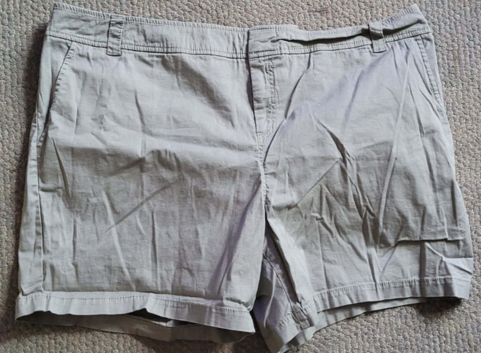 These shorts are in good used condition. There are no holes or stains that I found. The closure and the zipper works well. The size is 22W. Measurements are approximately: Waist: 22 inches. Length: 18 inches. Inseam: 5.5 inches. Rise: 13 inches.