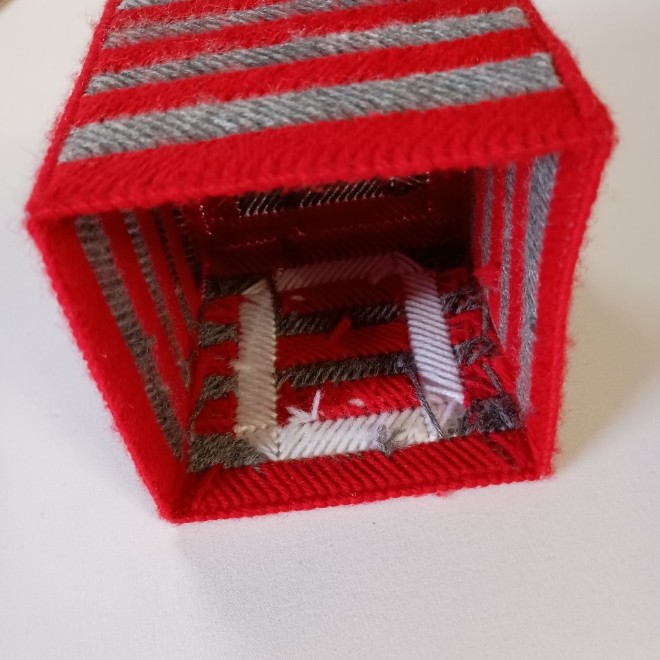 This vintage needlepoint Kleenex tissue box cover features a white block O pattern and scarlet and gray colors, making it a unique addition to any room. Handmade with plastic and yarn materials, this small square-shaped cover is perfect for Ohio State football fans with its themed design. Measuring 4.5" in length and height, and 5" in height, this boxed cover is a charming and functional bathroom accessory for adults. Normal wear. Sizes are approximate.