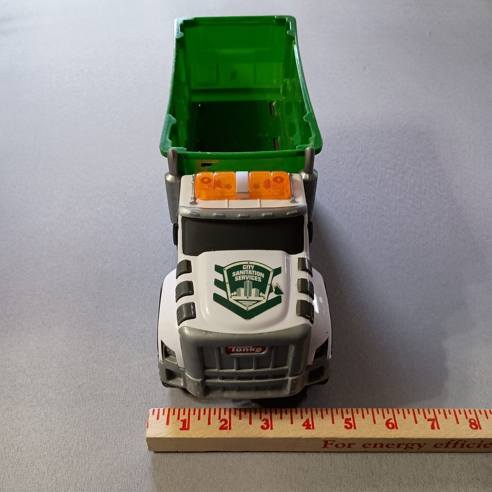 The Tonka Hasbro Funrise Sanitation Dept Truck is a plastic toy vehicle that features a white and green color scheme, representing a city sanitation truck. This toy includes non-working lights and sounds, perfect for imaginative play. Designed for children aged 8-11 years, this toy truck is free-rolling and made in Vietnam. With a focus on sanitation and city life, this toy is a fun addition to any toy collection. Normal wear, scratches. Sizes are approximate.