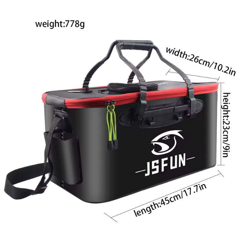 JS-TEC Portable Folding Fishing Bucket is made of thickened EVA+PP material, ensuring waterproof durability and long service life. Ideal for fishing, camping, hiking, car washing, or water storage. Can also be used as a live fish or bait bucket. Equipped with side pockets for an oxygen pump (pump not included) and a mesh lid for easy fish handling. Adjustable shoulder strap provides comfort and stability, making it more practical than standard round buckets. Easy to clean ? just rinse with water after use.