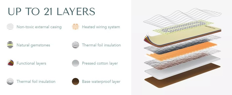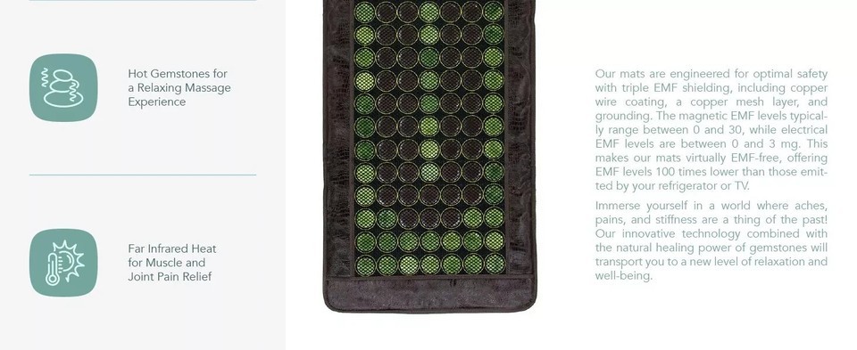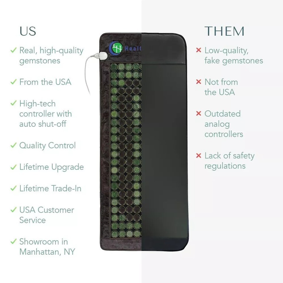 Gemstone mats are commonly used for natural therapy, but HealthyLine?s deep penetrating heat therapy pad stands out in terms of quality and effectiveness. It is more advanced compared to others on the market. Our mats are made using some of the finest jade and tourmaline stones, which work together excellently to promote wellness. The mat utilizes advanced Far-Infrared (FIR) technology, which involves energy waves penetrating through the nine layers to initiate the remedial process.