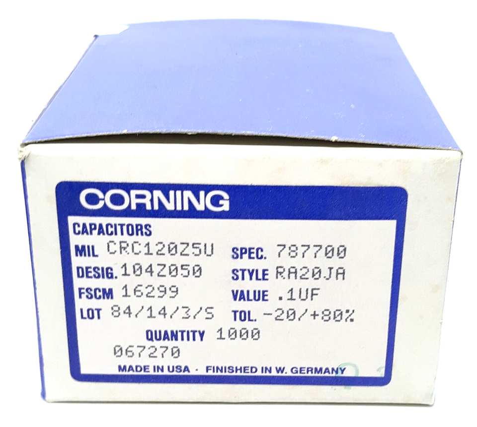 Corning Ceramic Capacitors CRC120Z5U Value .1 UF Tol .-20/+80% 50V Box Of 1000