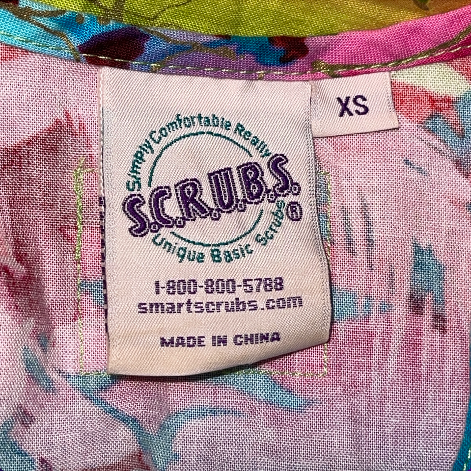 Excellent condition. No sign of wear. Size tag XS extra small. Measures 19 inches across the chest and 26 inches overall length and 18.5 inch 3/4 long sleeves. Please see all gallery photos. Super cute scrub shirt. Very gorgeous and vibrant with gold flecks. Some longer slits at side. Perfect for a nurse, vet, tech, xray, lunch line, etc. Please see all gallery photos. We are a smoke free, pet friendly home. Have a great day!