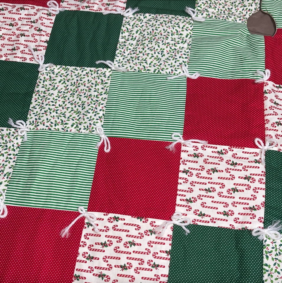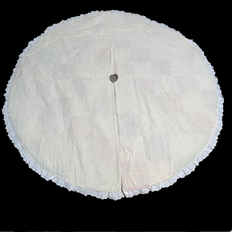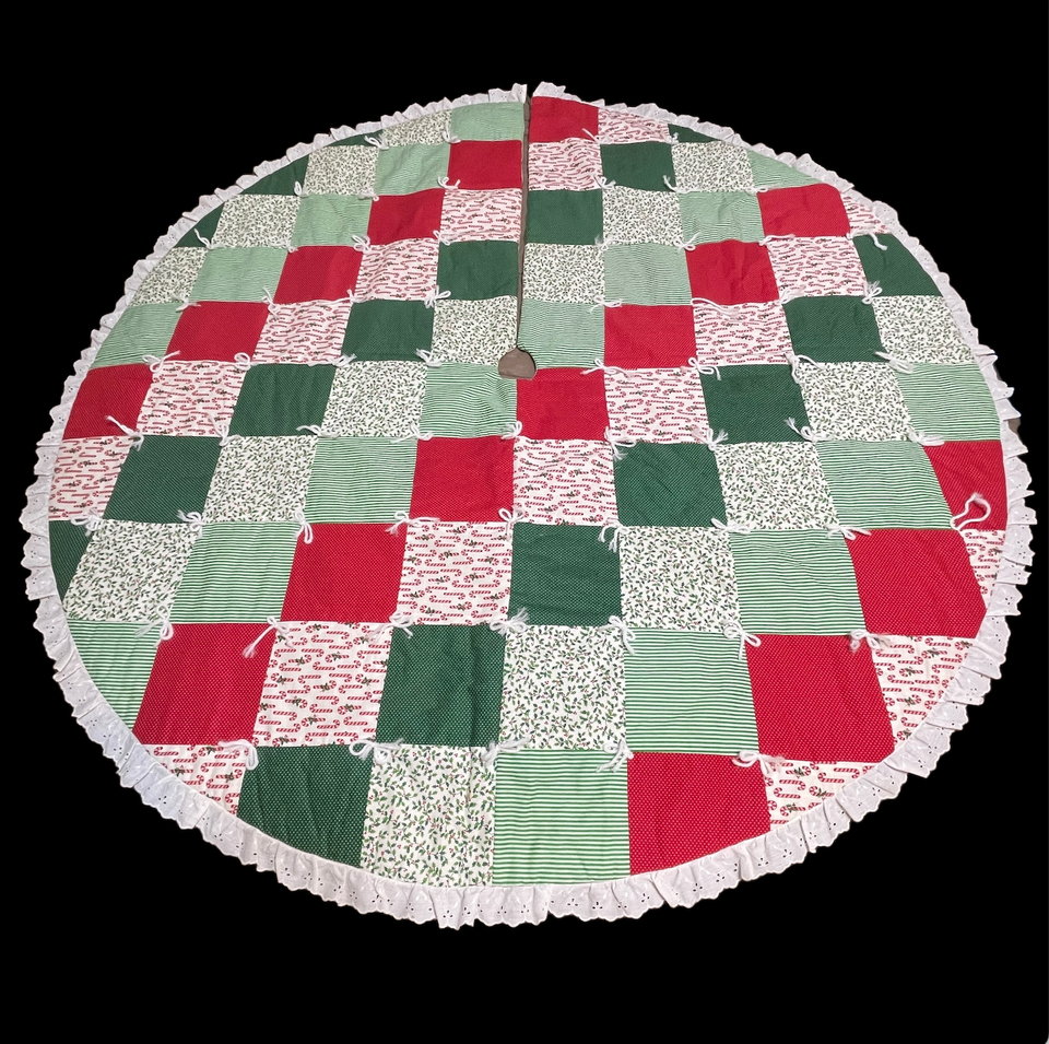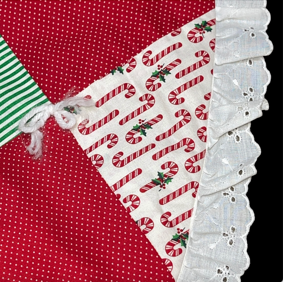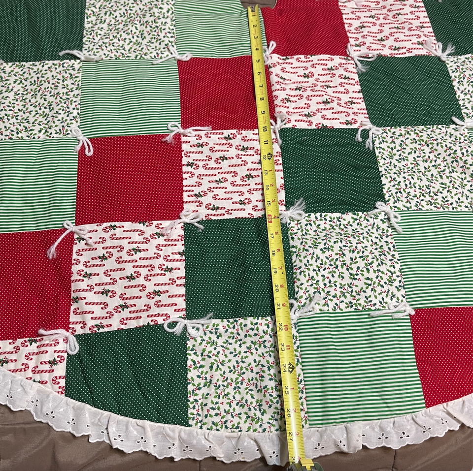 Excellent condition. Top side is perfect, the under side has a few very very light marks. Very large, measures 58 inches in diameter. Super cute holly berry, candy cane, polka dot pattern with lace trim. Please see all gallery photos. We are a smoke free, pet friendly home. Have a great day!