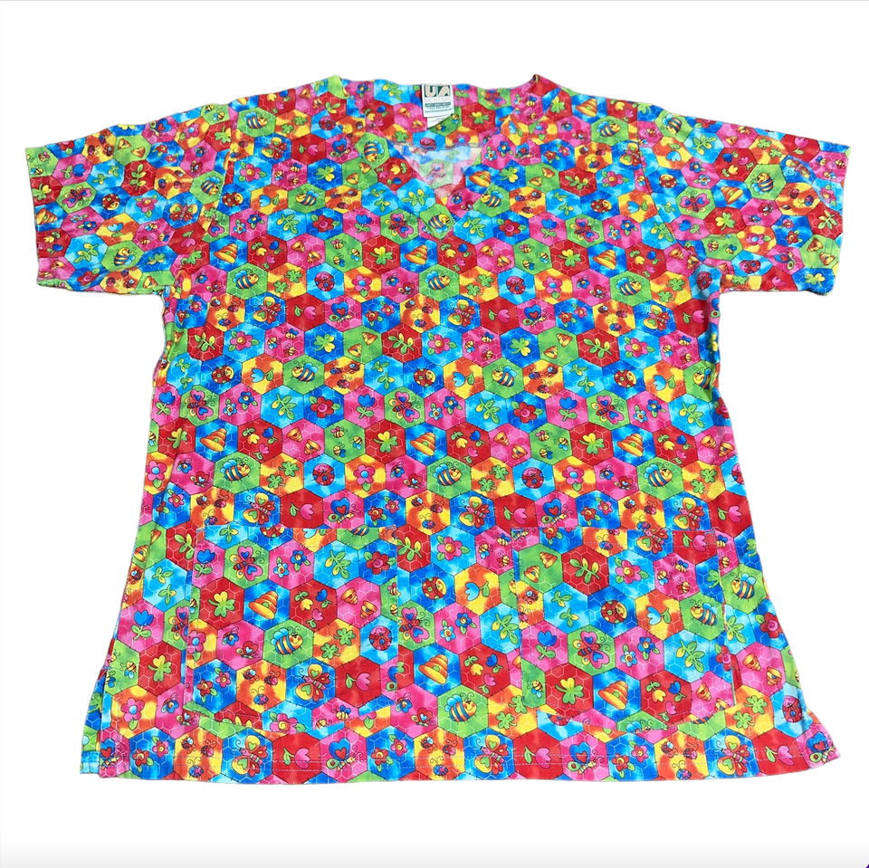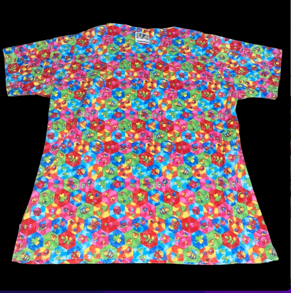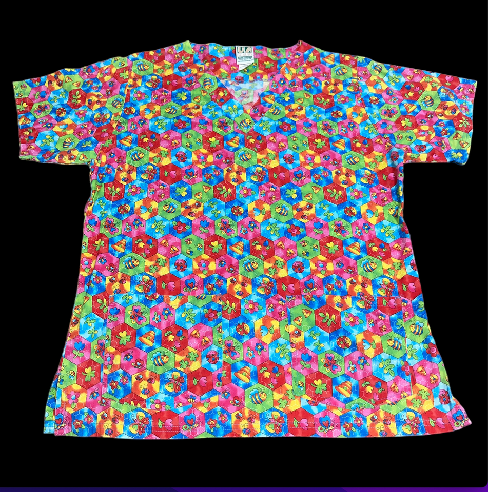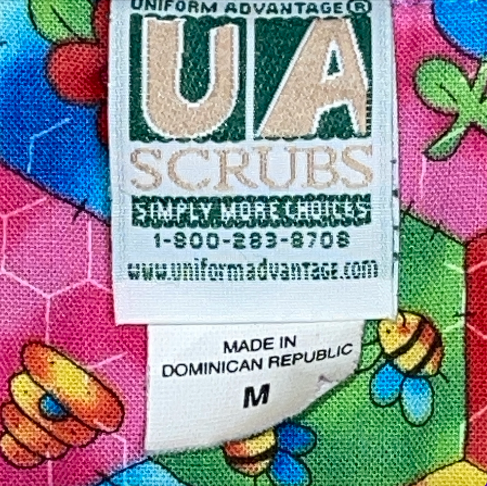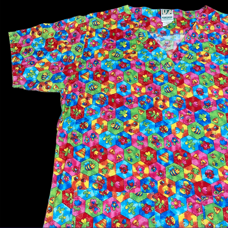 UA Pink Bee Honeycomb Ladybug Floral Butterfly Medium Scrub Top Shirt Bright