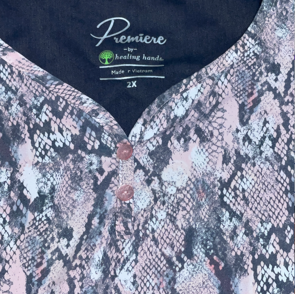 Premiere By Healing Hands Women’s Scrub Top Pink Gray Snake Skin Print Plus 2X