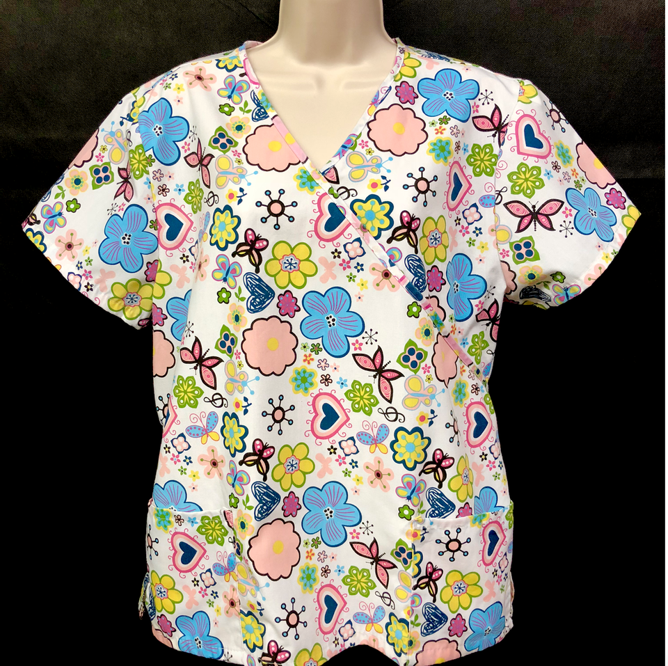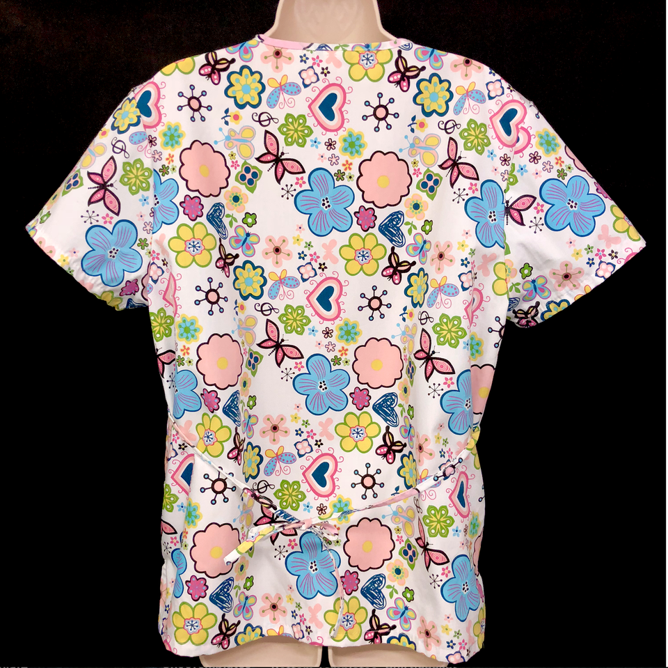 DENICE Scrubs Shirt Dental Medical Nurse Tie Back Floral Butterfly Sz Large