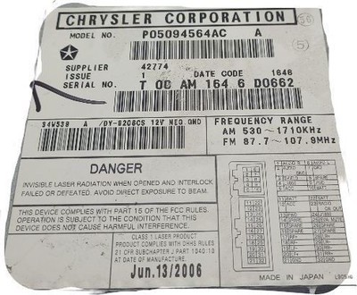 PACIFICA 05-06 receiver, radio, AM-FM-CD player and changer control (opt RAH)