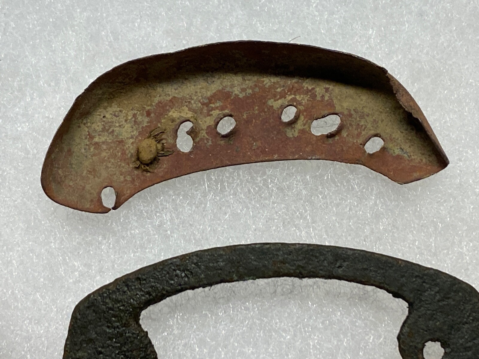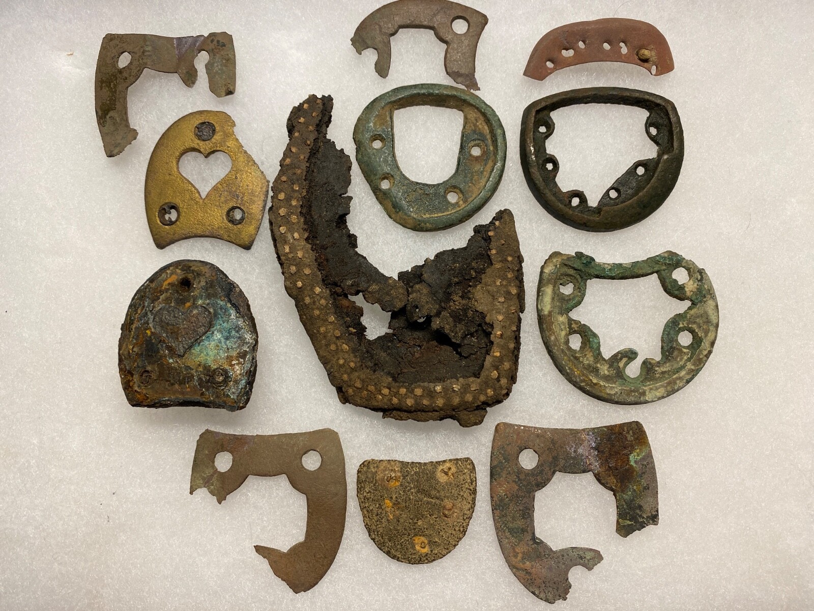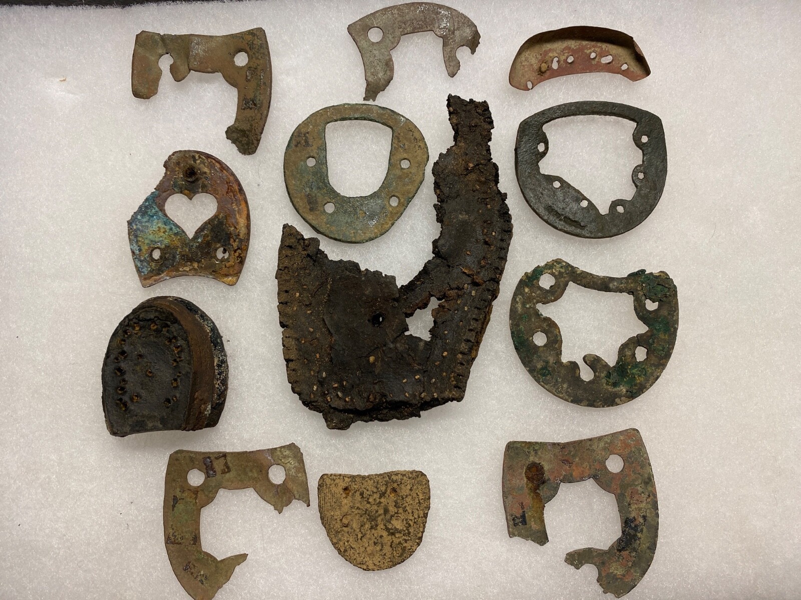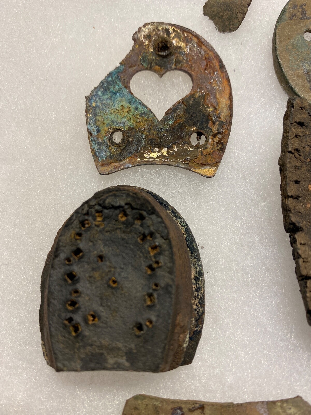 This is a grouping of bootee or brogan shoe fragments, relics. Nice an assortment of toe and heel plates. Also includes the heart pattern heel and heel plate.