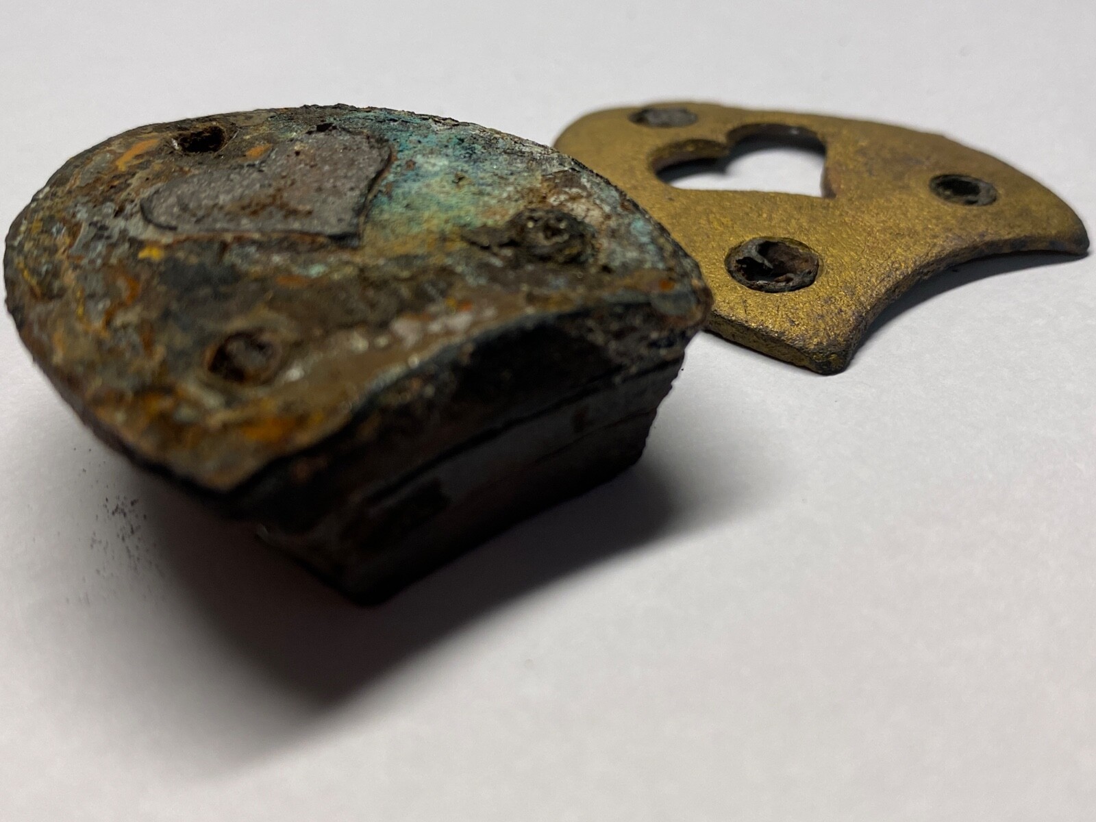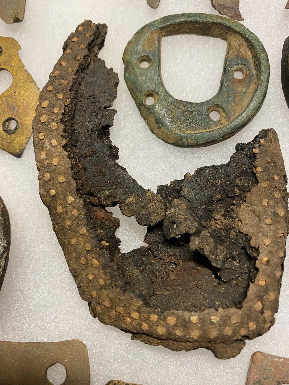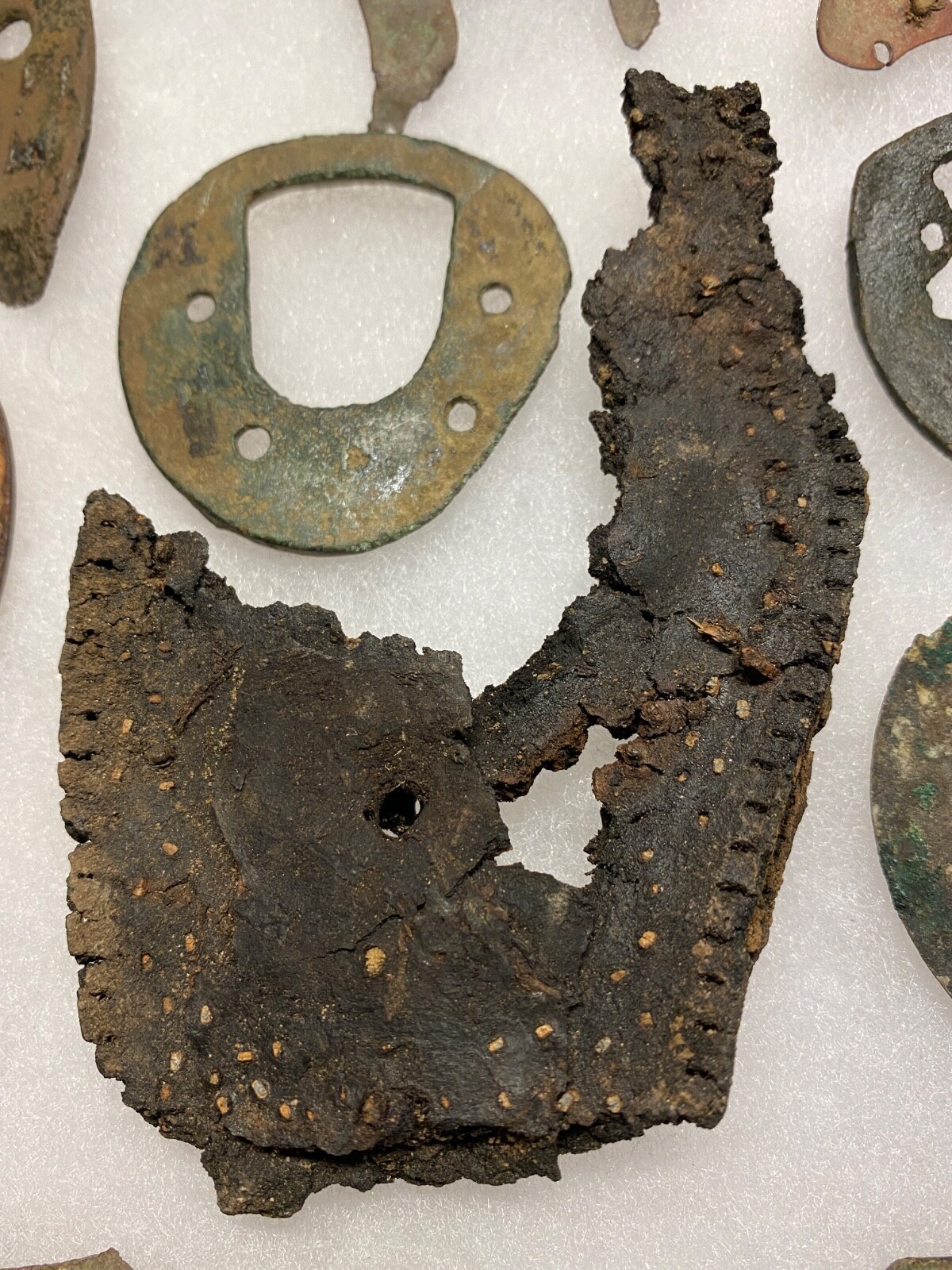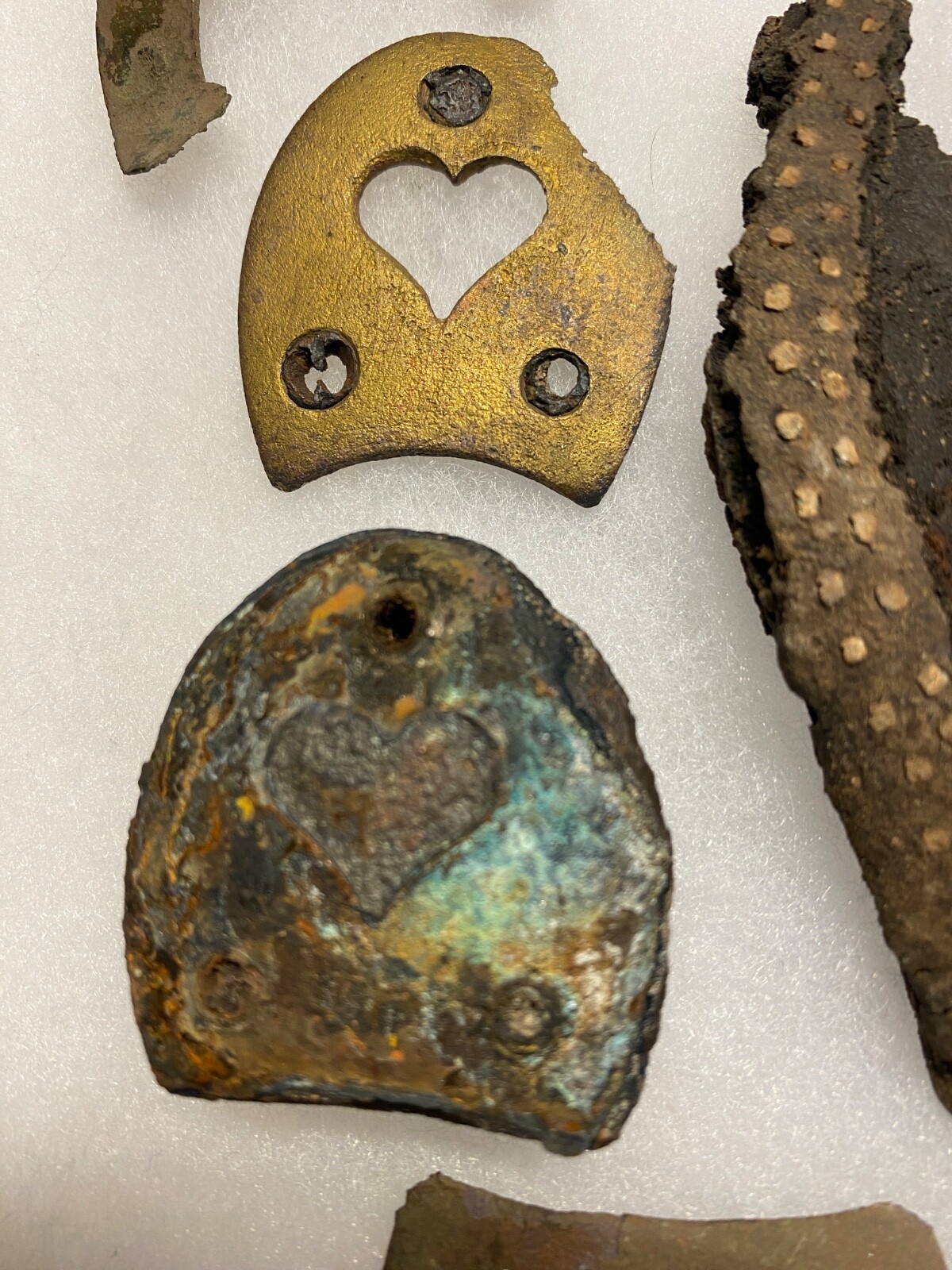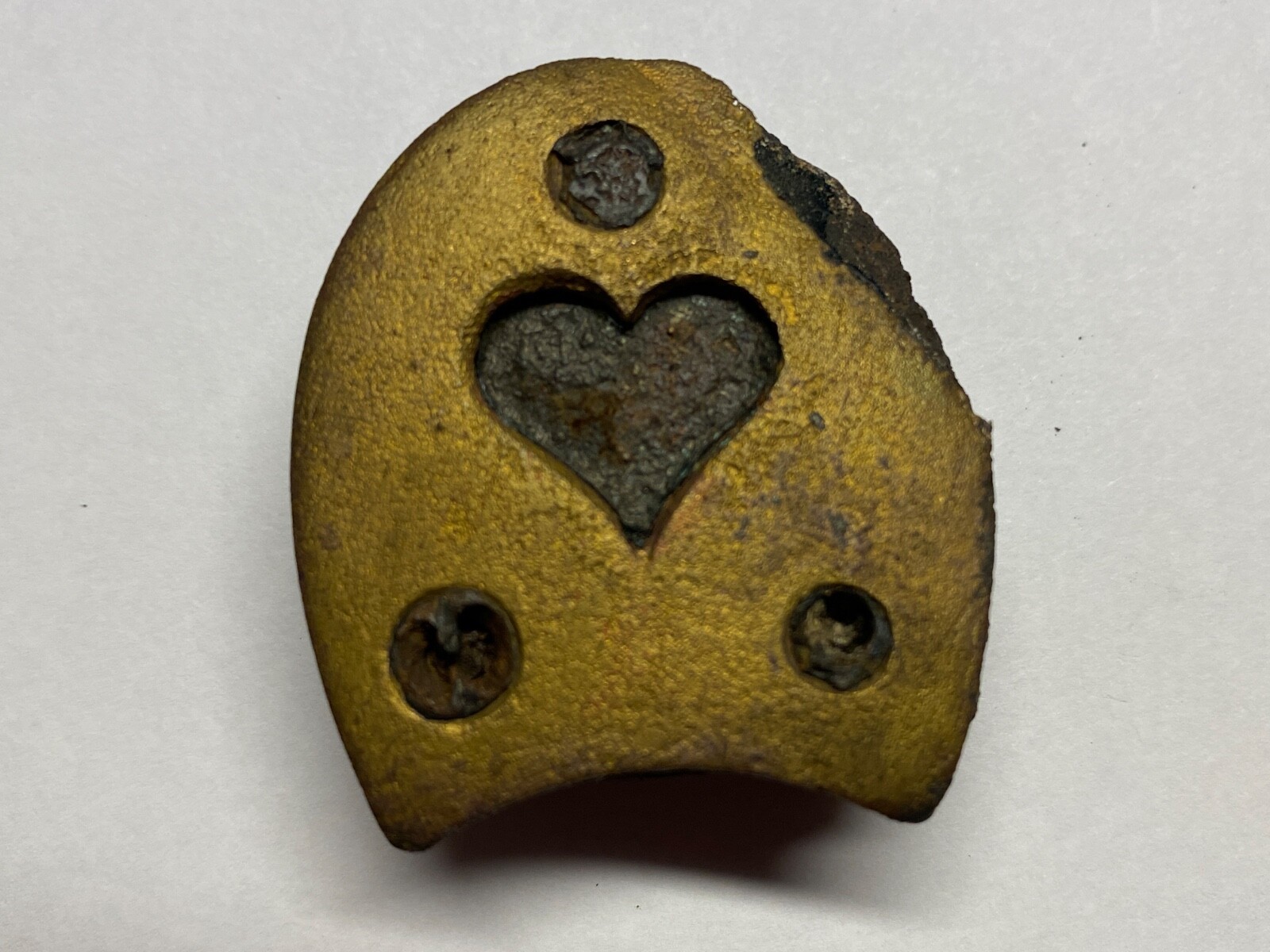 This is a grouping of bootee or brogan shoe fragments, relics. Nice an assortment of toe and heel plates. Also includes the heart pattern heel and heel plate.