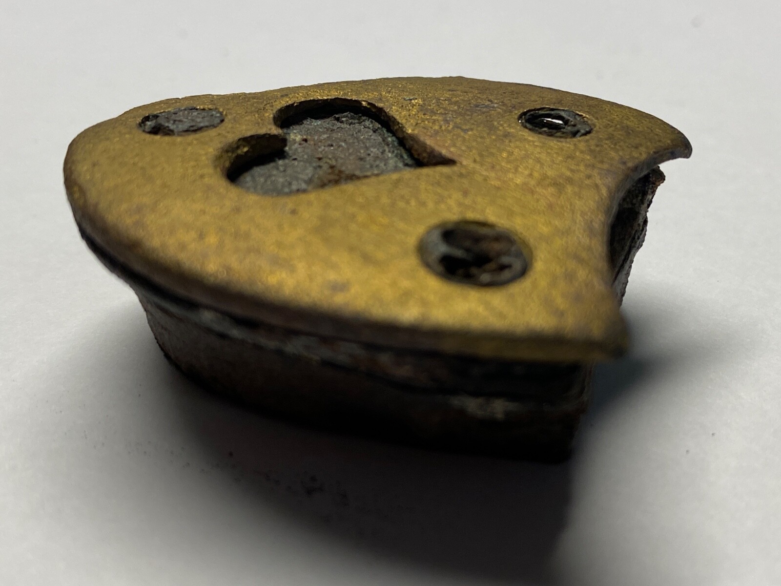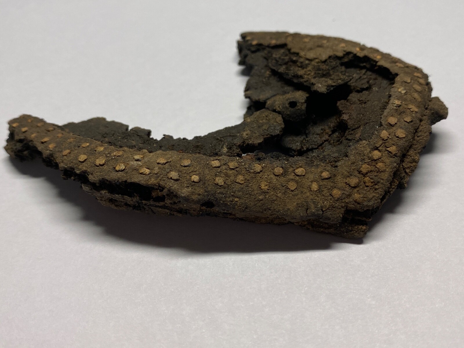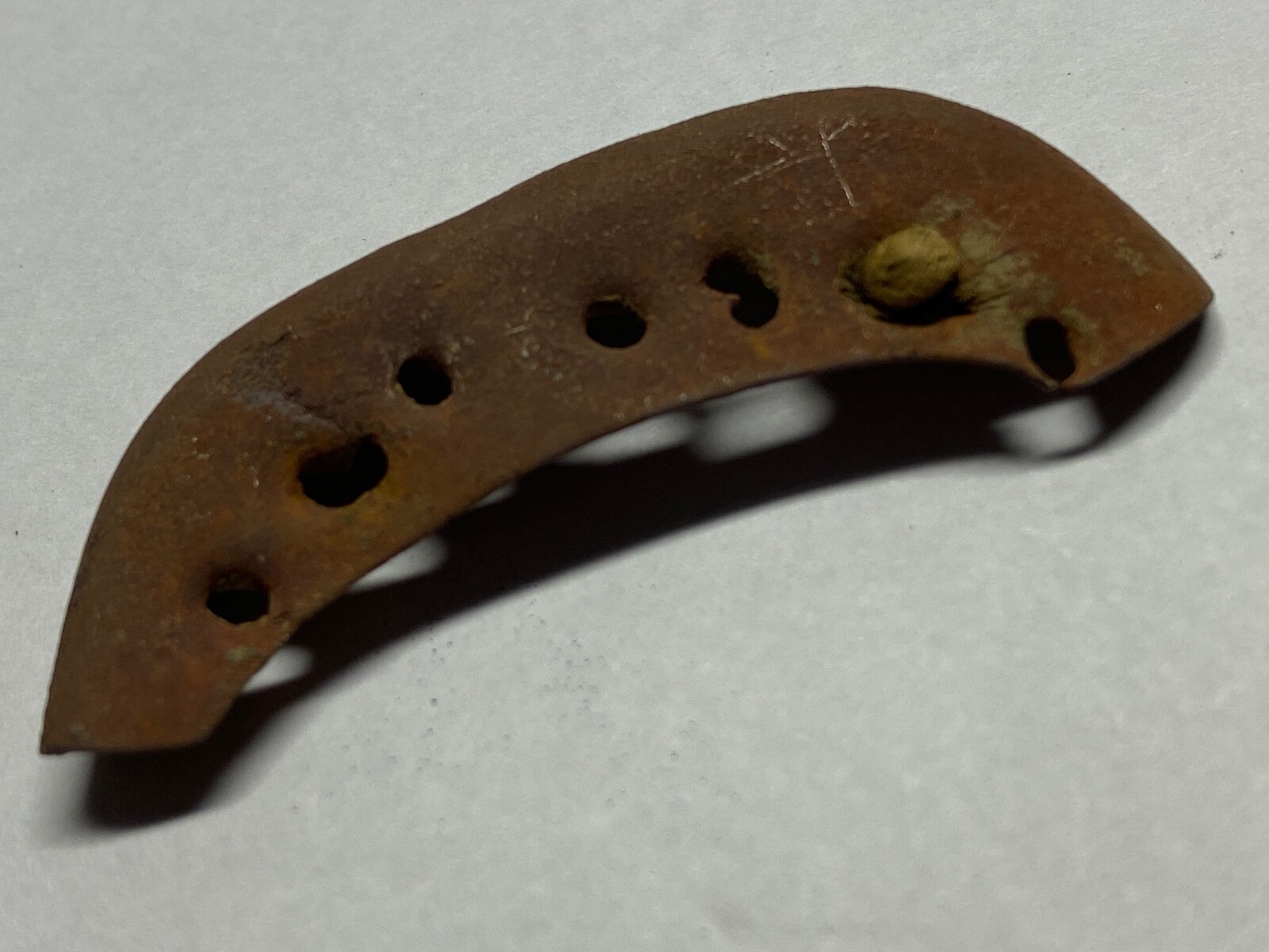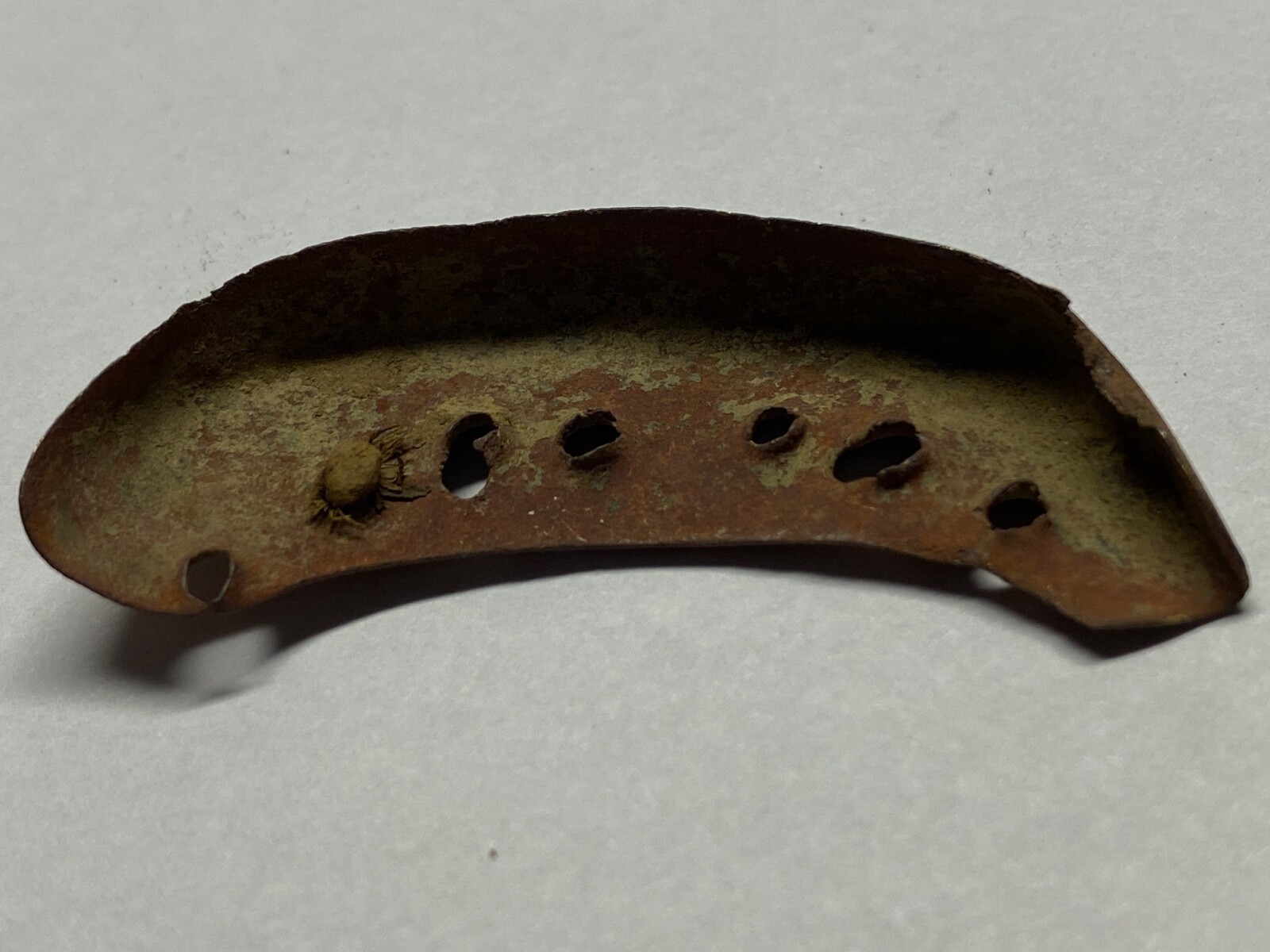 The leather fragment of layered sole section with wooden pegs is most likely from a soldiers 1851 Pattern Jefferson Bootee shoe. The stitch/Peg holes are very prominent on these pieces. This artifact measures approx.. 4-1/4? x 2-3/4? x OE? thickness and weighs approx.. 1 ounce.