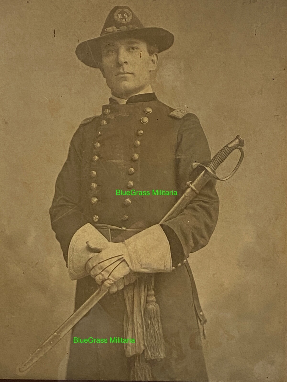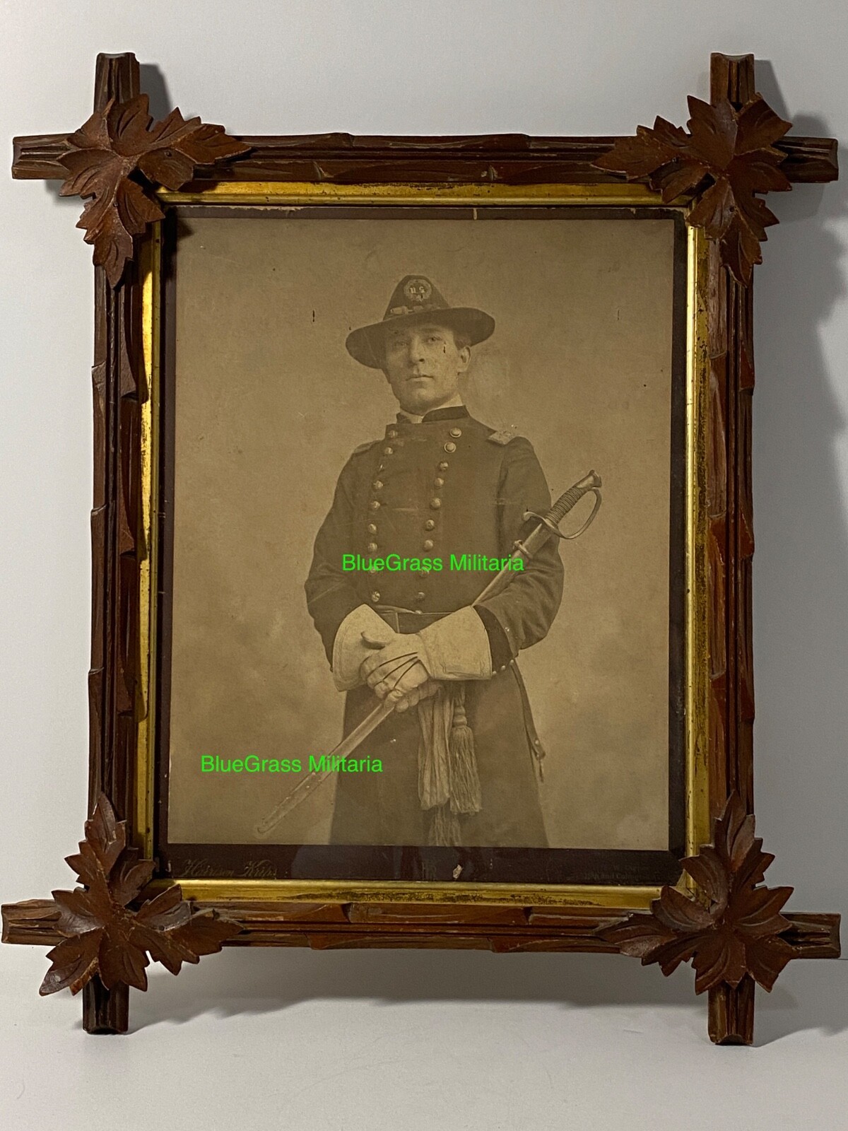 Large framed image of a Cavalry Officer in full uniform with saber.