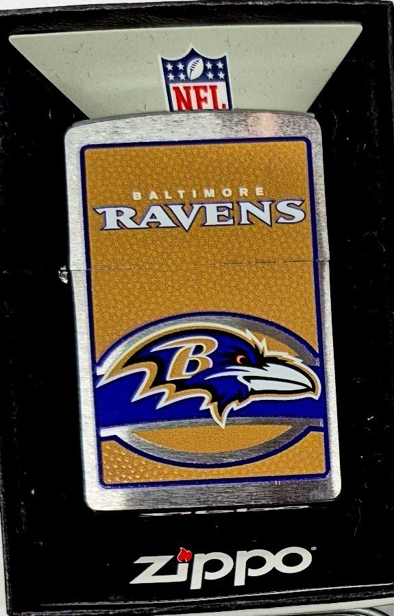 The product is a retired NFL Baltimore Ravens Zippo lighter with a leather look design, showcasing the team's colors and logo. Made in the United States by Zippo, this collectible item is perfect for fans looking to add a unique piece to their sports memorabilia collection. The lighter combines a sport-themed design with the well-known quality of Zippo lighters, making it a desirable item for both football enthusiasts and Zippo collectors alike.
