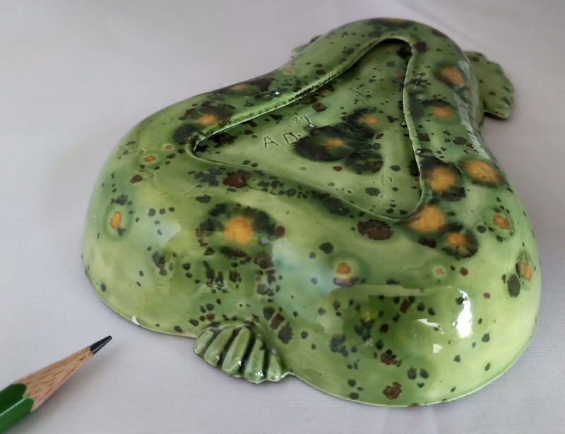 Pear-shaped dish in greens, orange and brown measures approximately 7 3/8" L x 5" W x 1" H. Marked 'AD '87' on the bottom.