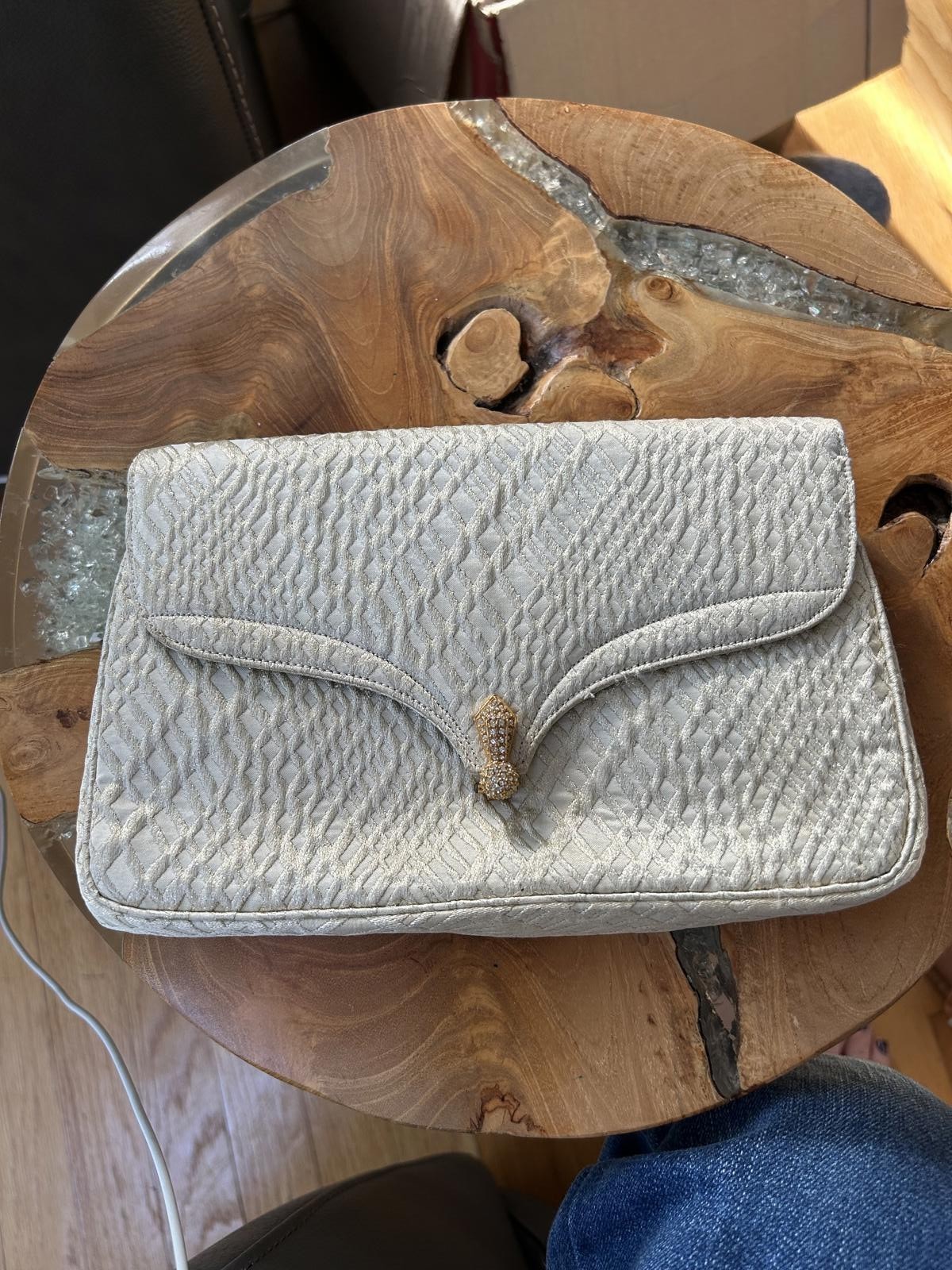 Elegant creme women's clutch featuring a textured pattern and a decorative gold-tone clasp with rhinestone embellishments.