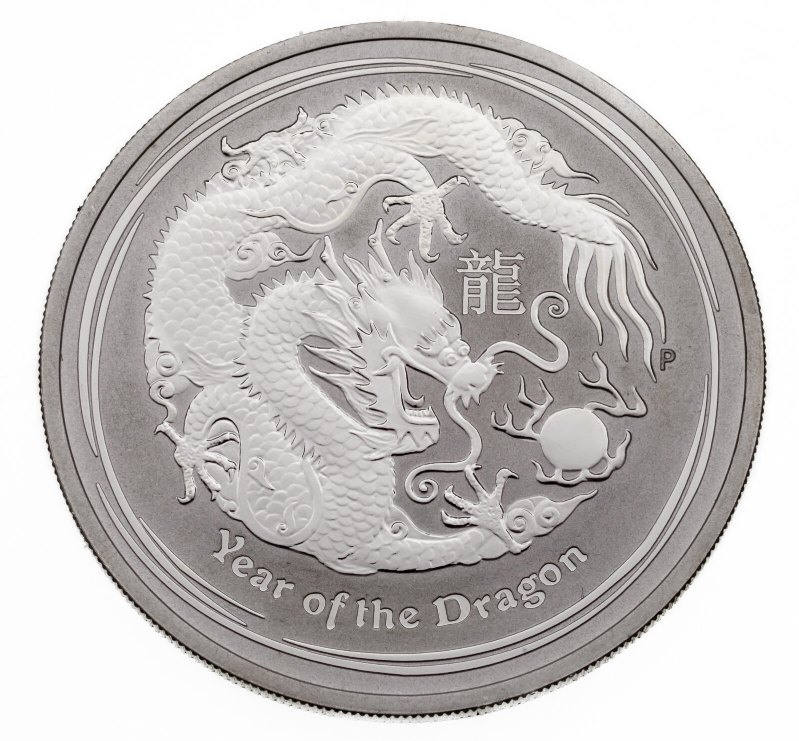 Avers propose une image d'un dragon incurve sur fond mat avec inscription "Annee du dragon" + caractere chinois