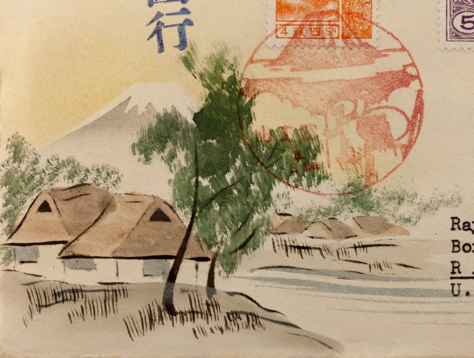 Karl Lewis 1934 Couvre aquarelle peinte a la main au Japon a OR, USA Fujiyama C-5