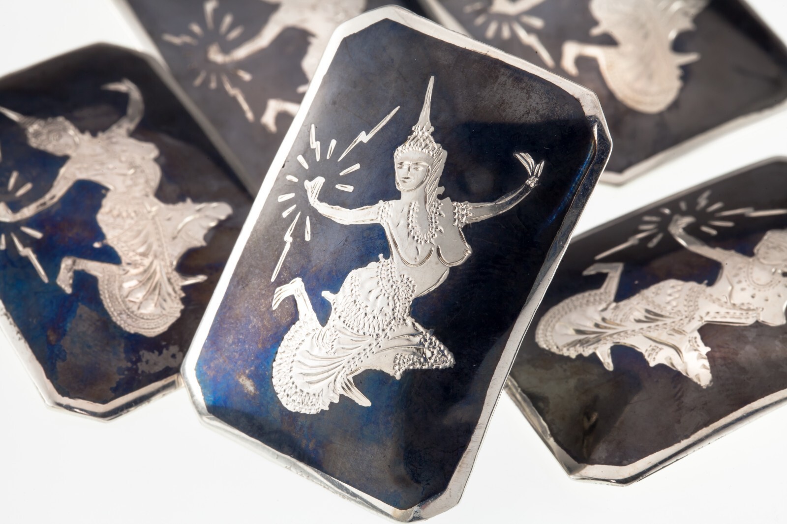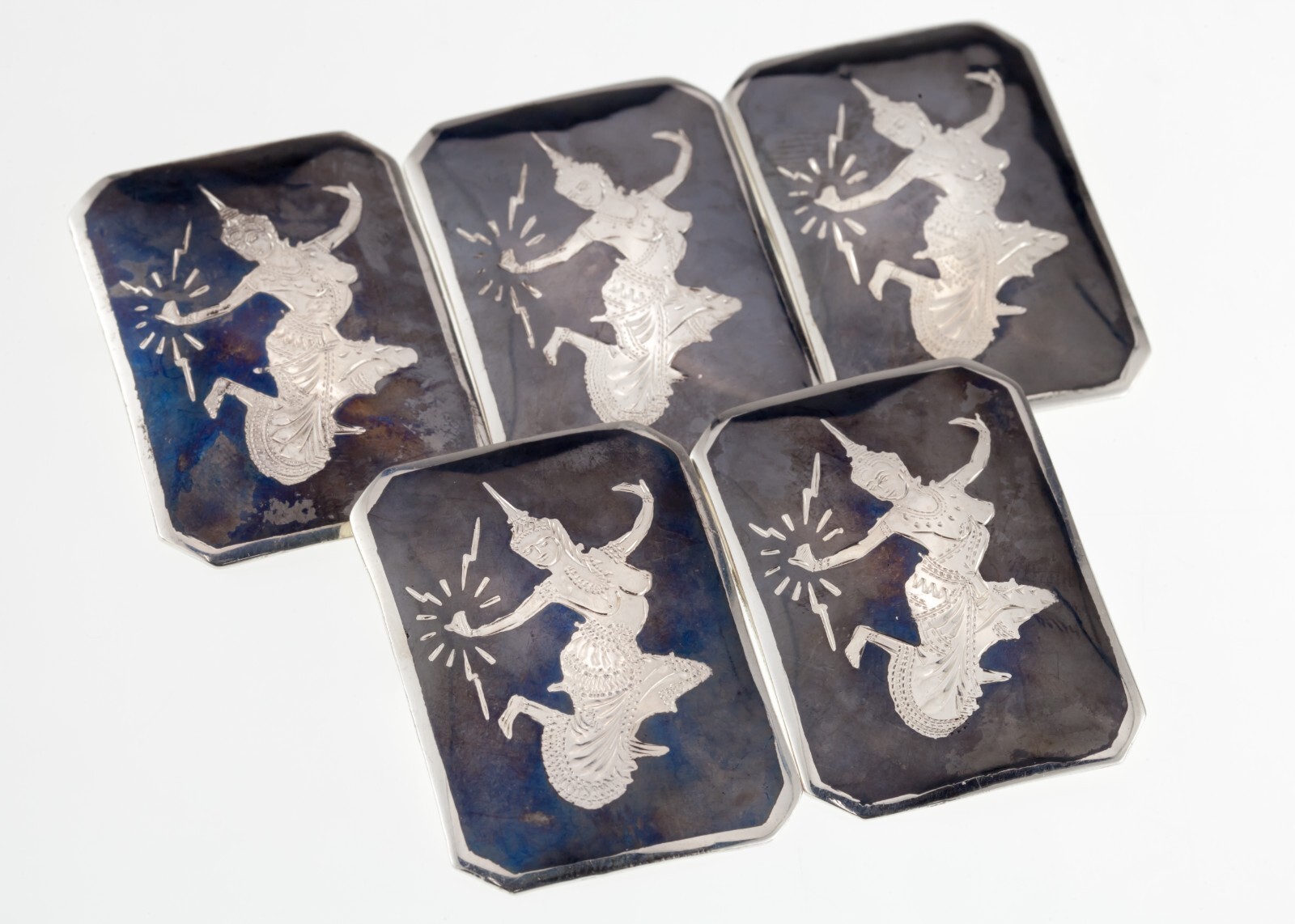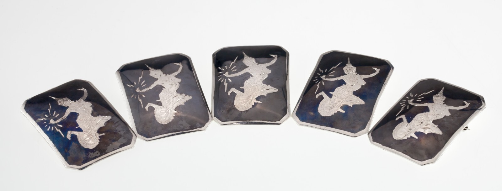 Magnifique Argent Sterling Siam Niello Émail Broche Ensemble De 5 (49.1g)