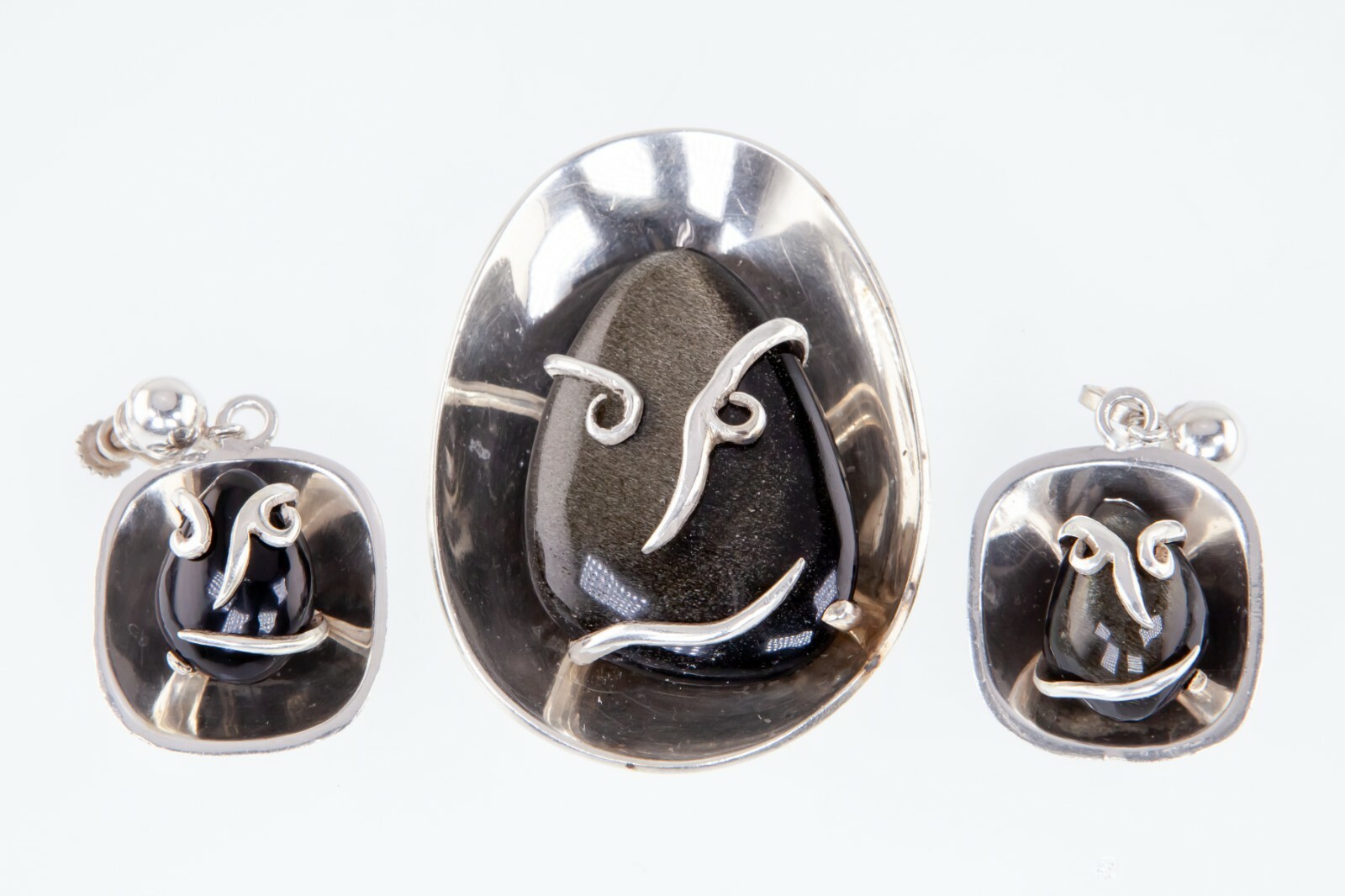 Vintage Mexico Ae Bijoux Set Pendant et boucles d'oreilles avec obsidien Ensemble en sterling