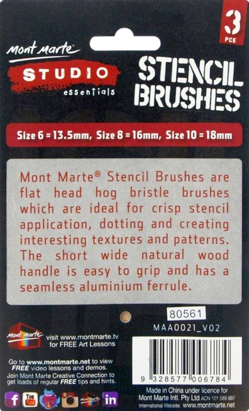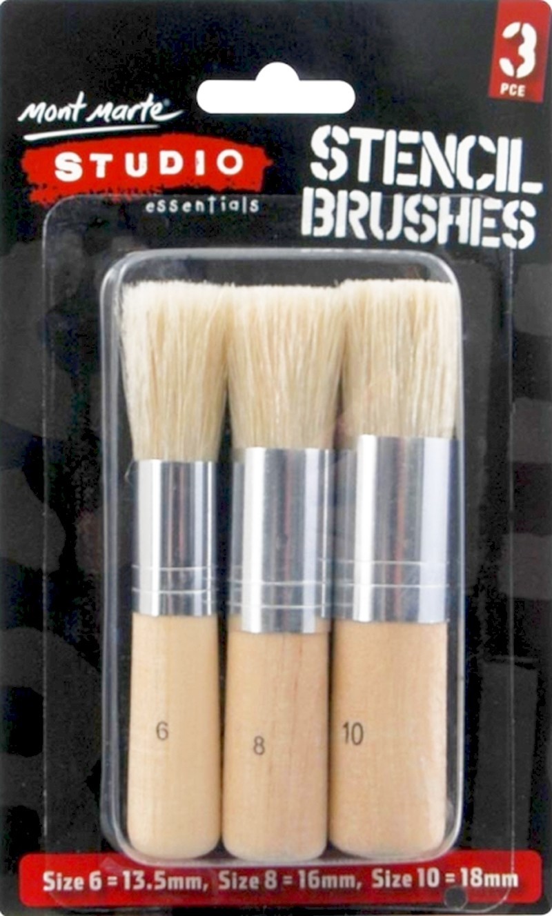 FOR SALE IS ONE (1) NEW PACKAGE OF THREE (3) ROUND STENCIL BRUSHES SIZES 6, 8 and 10 WITH HOG BRISTLE AND WOOD HANDLE BY MONT MARTE STUDIO ESSENTIALS BRAND MPN MAA0021 UPC# 9328577006784. MONT MARTE STUDIO ESSENTIALS STENCIL BRUSHES ARE REAL HOG BRISTLE BRUSHES WHICH ARE IDEAL FOR CRISP STENCIL APPLICATION, DOTTING AND CREATING INTERESTING TEXTURES AND PATTERNS. THE 1 5/8" length SHORT AND BEEFY DIAMETER NATURAL WOOD HANDLE IS EASY TO GRIP AND HAS A SEAMLESS ALUMINUM FERRULE. THREE (3) BRUSHES ARE INCLUDED IN THIS PACKAGE, SIZE 6 IS 13.5mm,diameter, SIZE 8 IS 16mm diameter, AND SIZE 10 is 18mm diameter. THESE BRUSHES ARE SUITABLE FOR USE WITH MONT MARTE OIL PAINTS, MONT MARTE ACRYLICS, MONT MARTE GOUACHE AND MONT MARTE POSTER PAINTS. FOR BEST RESULTS CLEAN THOROUGHLY FOLLOWING USE, DO NOT ALLOW PAINT TO DRY ON THE BRUSH. REMOVE AS MUCH PAINT AS POSSIBLE WITH A PAPER TOWEL BEFORE RINSING WITH WATER OR TURPENTINE FOLLOWED BY CLEANER OR WARM SOAPY WATER. YOU WILL RECEIVE ONE (1) PACKAGE OF THREE STENCIL BRUSHES SHIPPED BY USPS FIRST CLASS MAIL.....